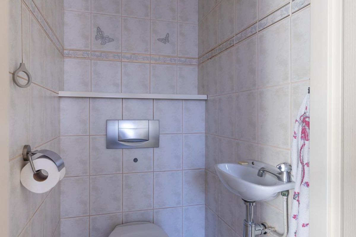 Via de achtergelegen hal bereik je het toilet met fonteintje en de deur naar de tuin.