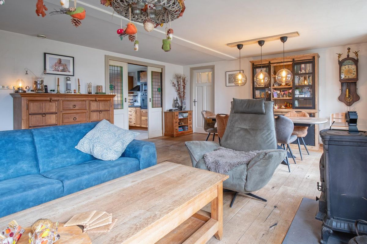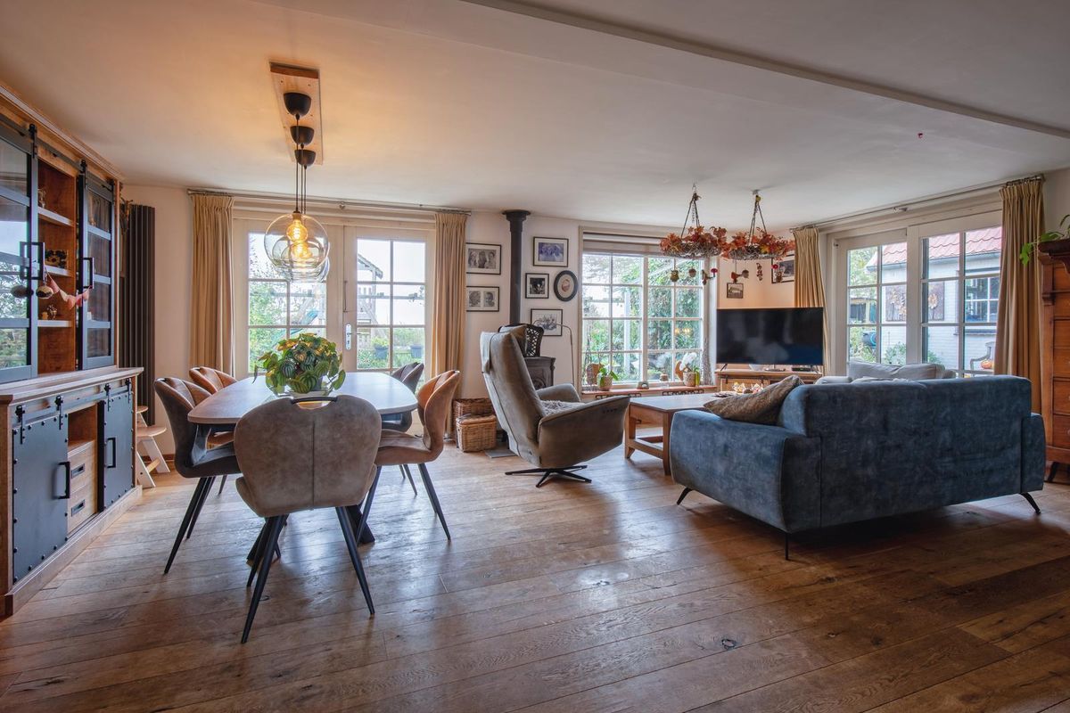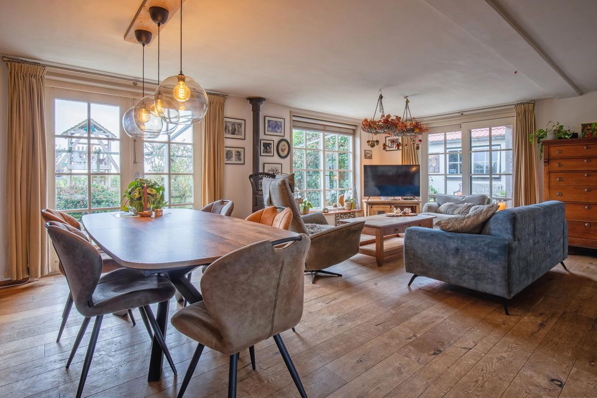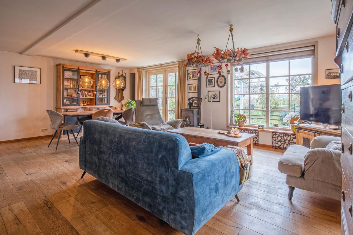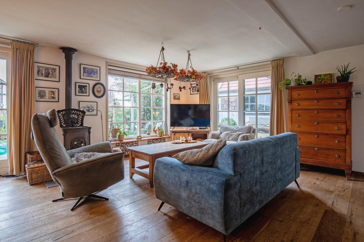 De woonkamer is gesitueerd aan de achterzijde en er is zowel een schuifpui als openslaande deuren naar de tuin. De woonkamer beschikt over sfeervolle houten vloerdelen en een gezellige haard. De begane grond is voorzien van vloerverwarming (behoudens het kantoor en de bijkeuken).