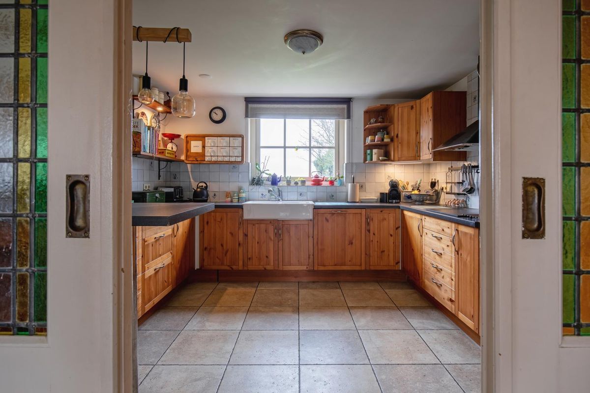 De keuken heeft een U-opstelling en is uitgevoerd met een dubbele spoelbak, kookplaat, afzuigkap, oven, magnetron, koelkast en vaatwasser. De ruimte naast de keuken is thans ingericht als kantoor, maar is ook prima geschikt als bijvoorbeeld een extra slaapkamer op de begane grond.