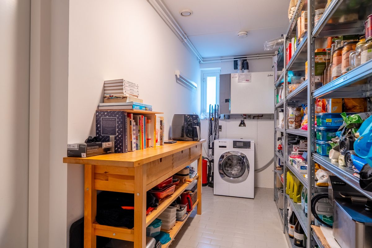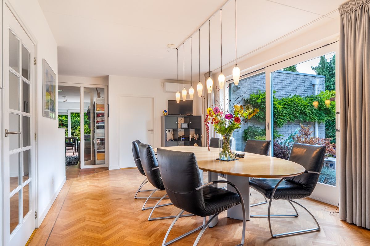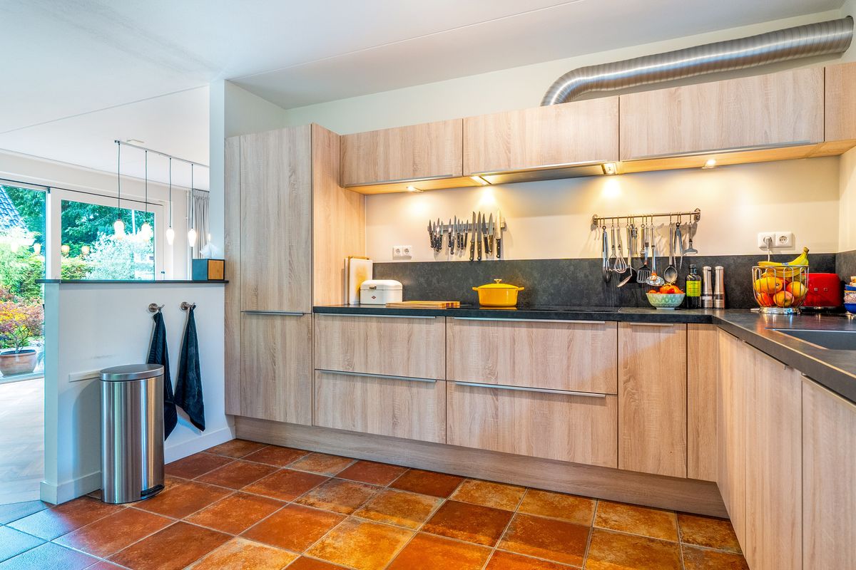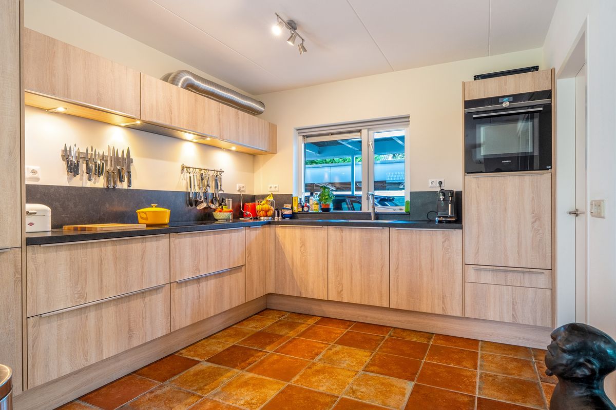 De woning straalt warmte en kwaliteit uit. De ruime woonkamer met een klassieke massief houten visgraatvloer vormt het hart van het huis. Dankzij vele raampartijen geniet je hier van veel natuurlijk licht en een open, luchtige sfeer. De open keuken met inbouwapparatuur sluit aan op het eetgedeelte en de bijkeuken, en vormt zo een praktische en gezellige leefruimte.