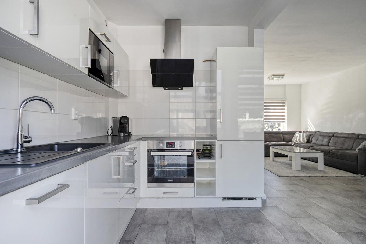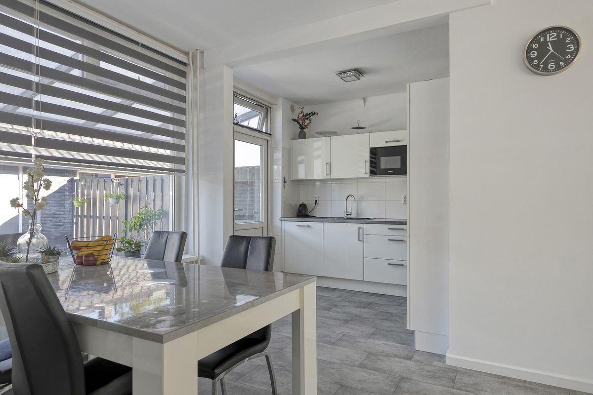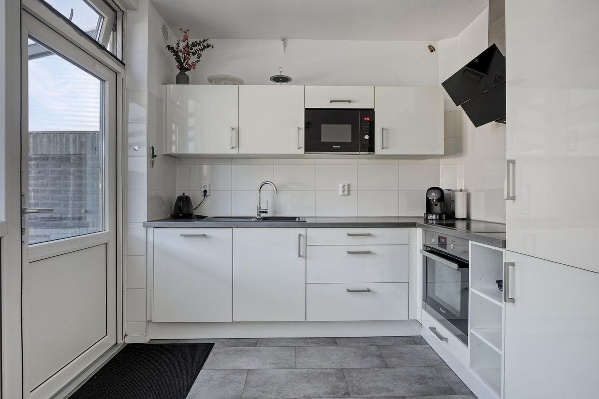 Je komt binnen in de hal met toilet en ruime meterkast. De lichte woonkamer voelt ruim aan en is afgewerkt met glad gestuukte wanden, plafonds en een laminaatvloer in neutrale tint. De open keuken in hoekopstelling sluit hier mooi op aan en is voorzien van moderne inbouwapparatuur zoals een inductiekookplaat, oven, vaatwasser, koelkast en vriezer.