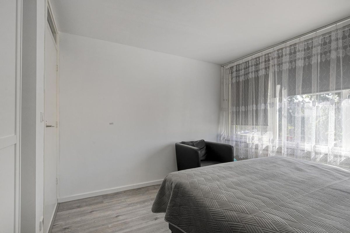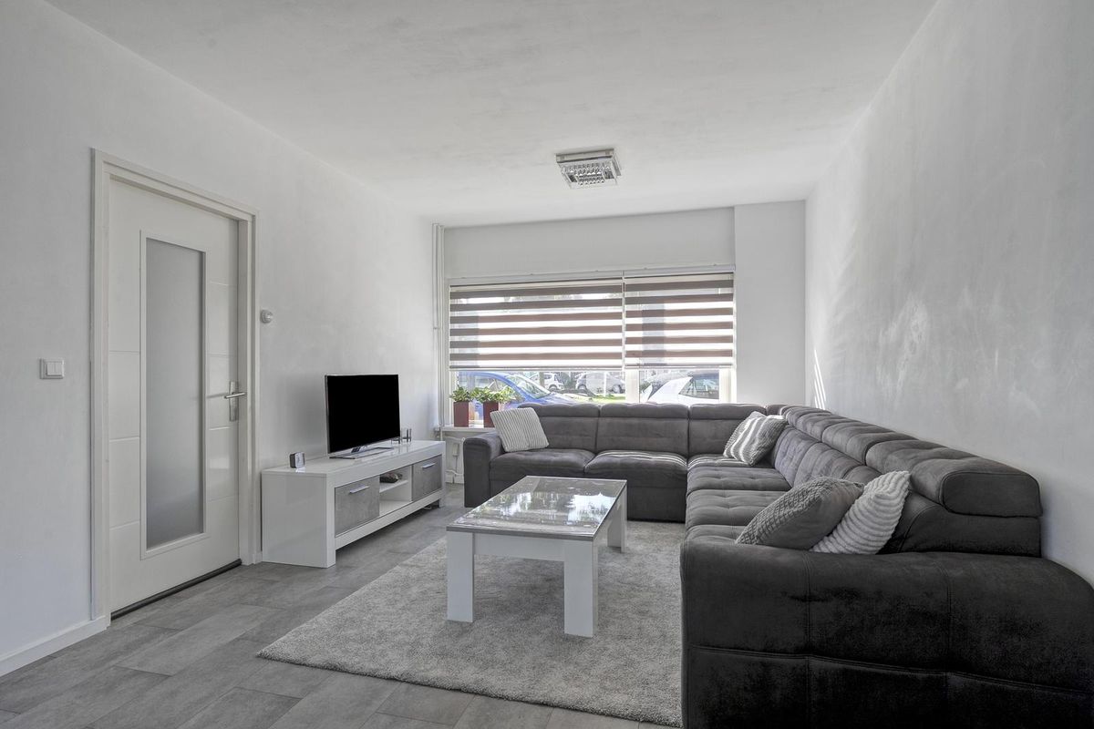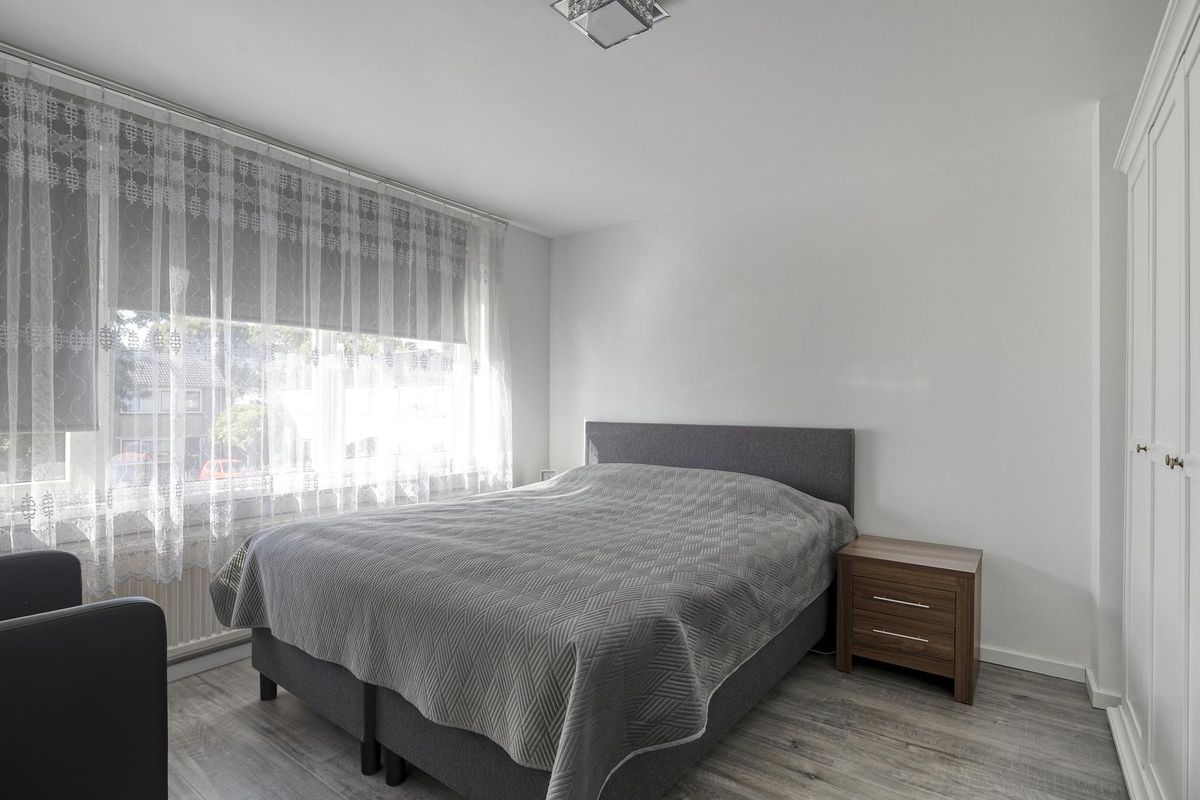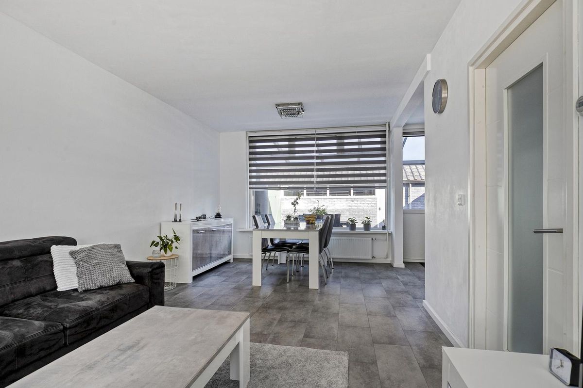 Je komt binnen in de hal met toilet en ruime meterkast. De lichte woonkamer voelt ruim aan en is afgewerkt met glad gestuukte wanden, plafonds en een laminaatvloer in neutrale tint. De open keuken in hoekopstelling sluit hier mooi op aan en is voorzien van moderne inbouwapparatuur zoals een inductiekookplaat, oven, vaatwasser, koelkast en vriezer.