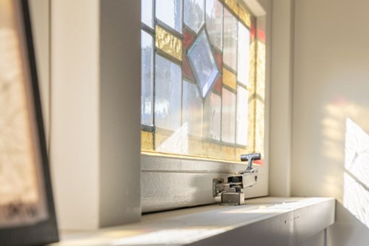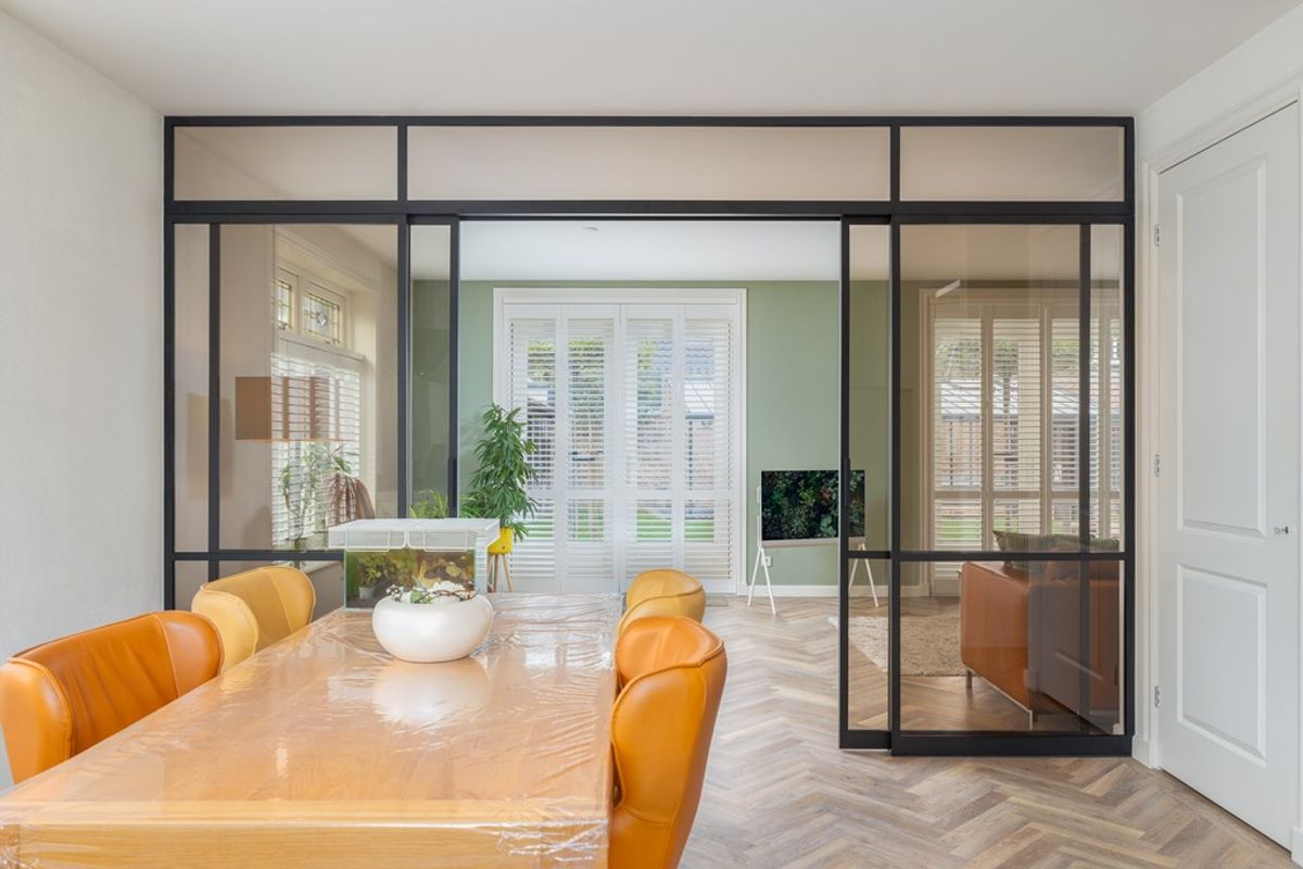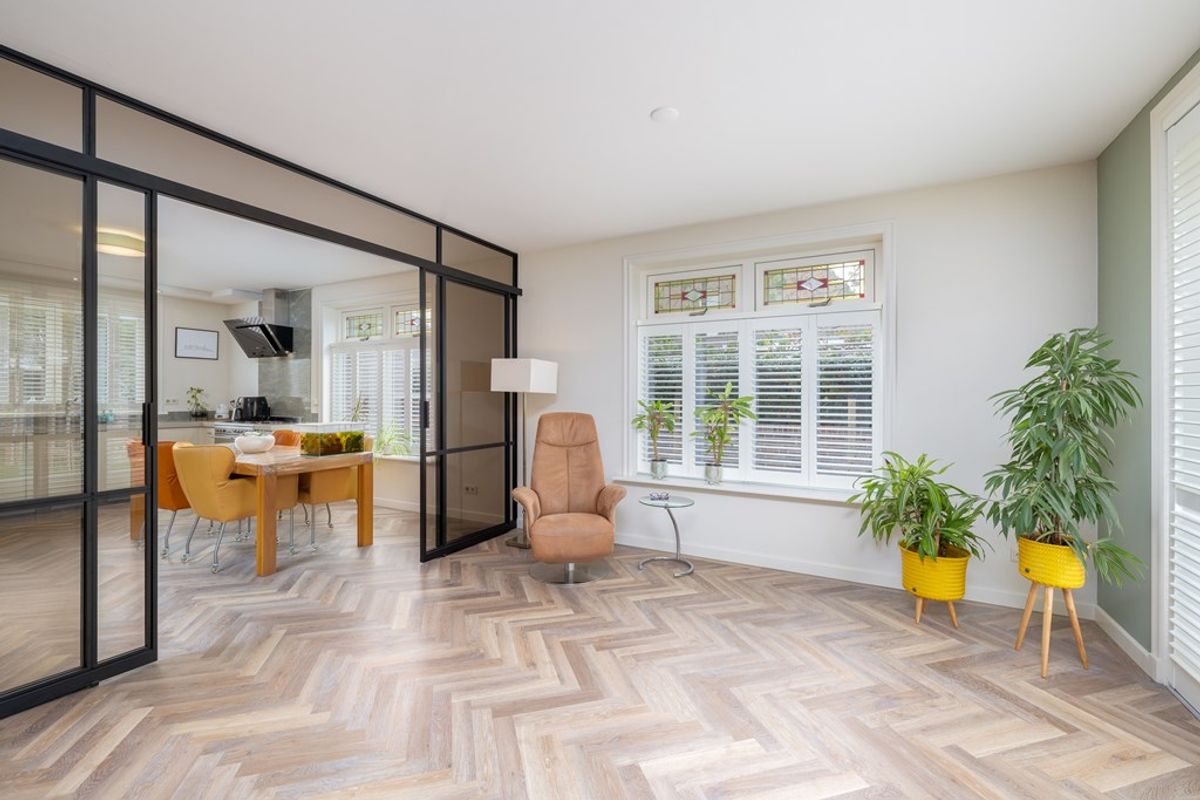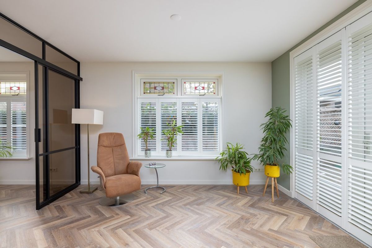 Binnen ontvouwt zich een interieur vol warmte en karakter. De stalendeuren, visgraatvloer met vloerverwarming en glas-in-lood accenten vormen samen een harmonieus geheel. De moderne woonkeuken is een plek van ontmoeting en samenzijn ruim, licht en ontworpen met gevoel voor sfeer.