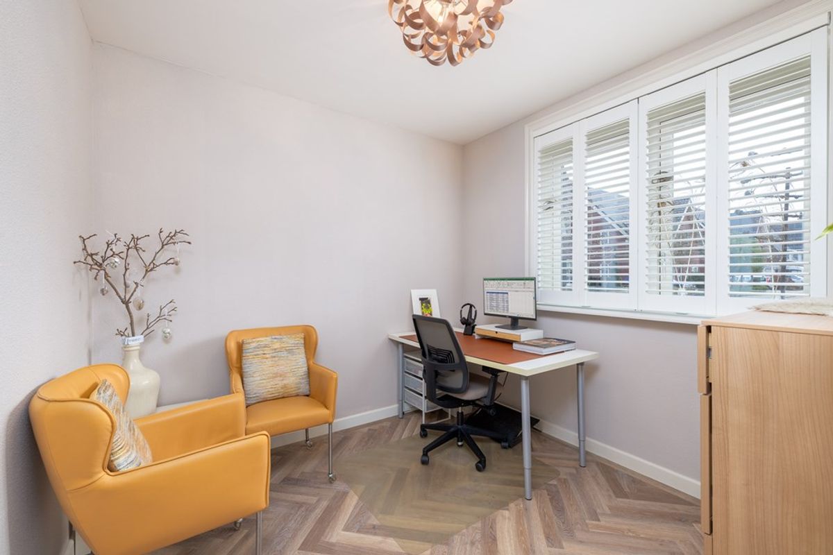 Aan de voorzijde bevindt zich een lichte werkkamer, ideaal voor wie thuiswerkt en toch verbonden wil blijven met de levendigheid van de straat. Achter de woning ligt een zorgvuldig aangelegde tuin, omgord door ommuring met siermetselwerk. Een groene oase van rust en privacy.