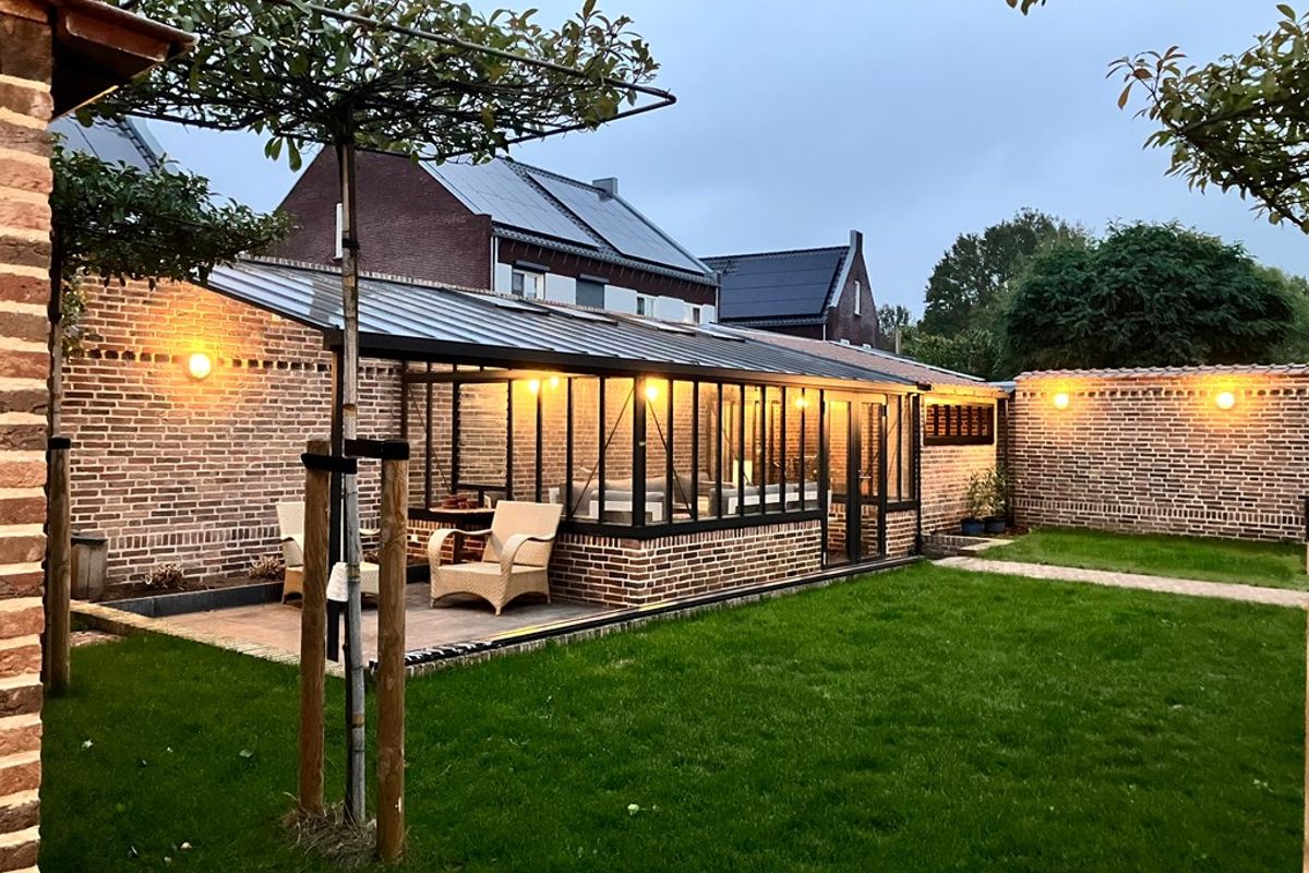 Het absolute middelpunt is de tuinkamer in orangerie-stijl: een elegante glazen aanbouw met een antracietstalen constructie en glazen dak. Hier vloeien binnen en buiten naadloos in elkaar over, terwijl de avondzon het glas zacht raakt en de ruimte vult met een warme gloed een plek om tot rust te komen, te dineren of simpelweg te genieten van het moment.