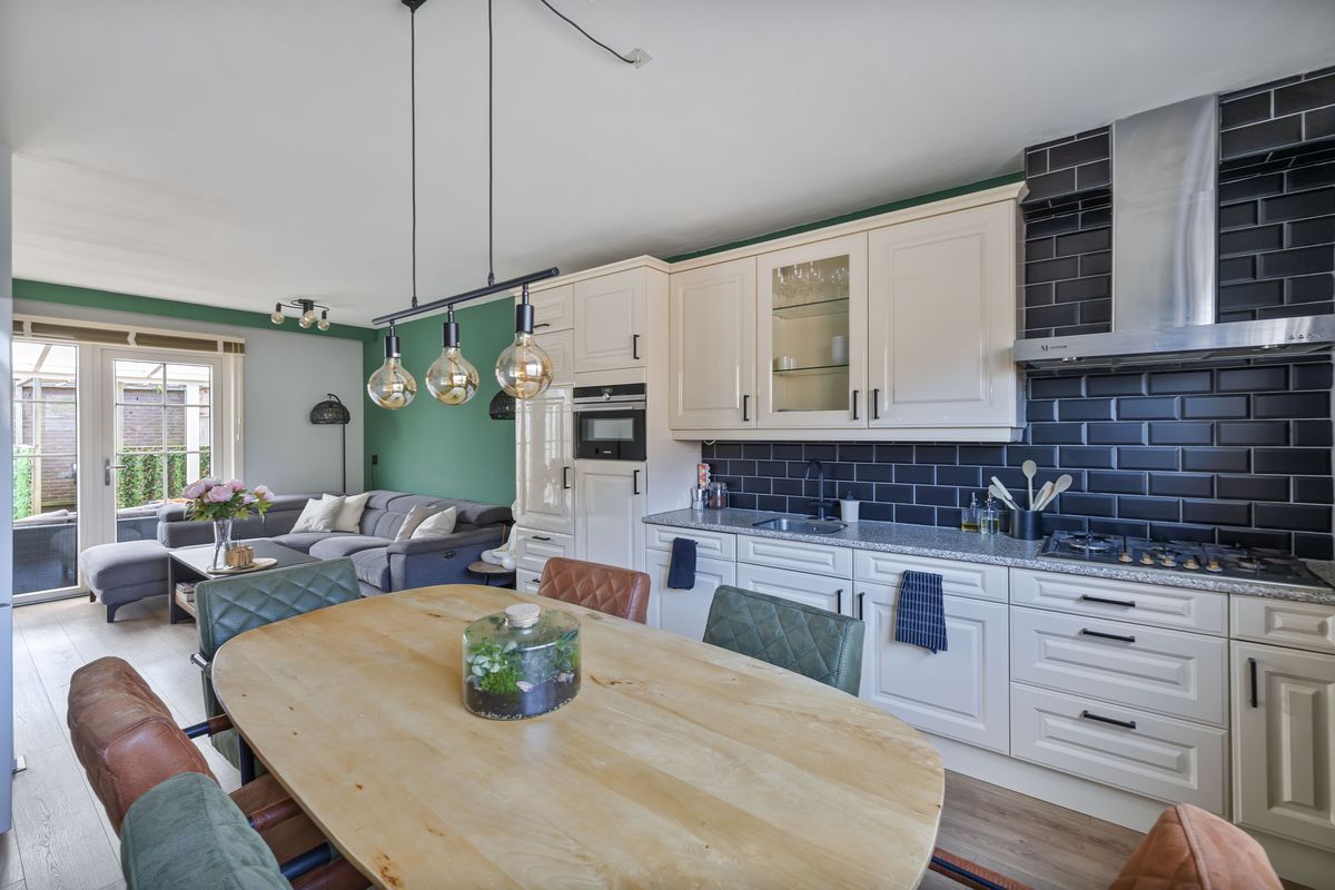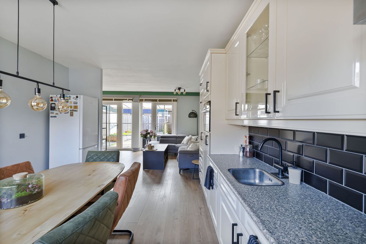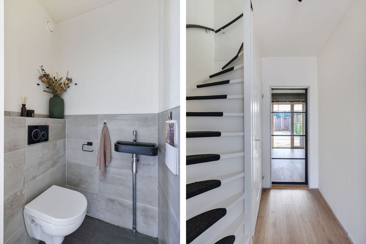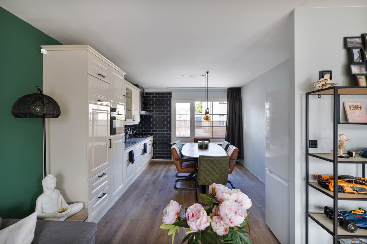 Je betreedt de woning via de hal met toegang tot het gerenoveerde toilet met fonteintje en de trapopgang naar de eerste verdieping. De woonkamer is sfeervol, ruim en voorzien van een fraaie laminaatvloer, strakke wandafwerking en twee toegangsdeuren naar de overkapping en de zonnige achtertuin. Aan de voorzijde bevindt zich de ruime keuken (2017) met voldoende werk en opberg ruimte. Hier tref je alle moderne inbouwapparatuur zoals een gaskookplaat, , combi magnetron, afzuigkap, vriezer en vaatwasser.