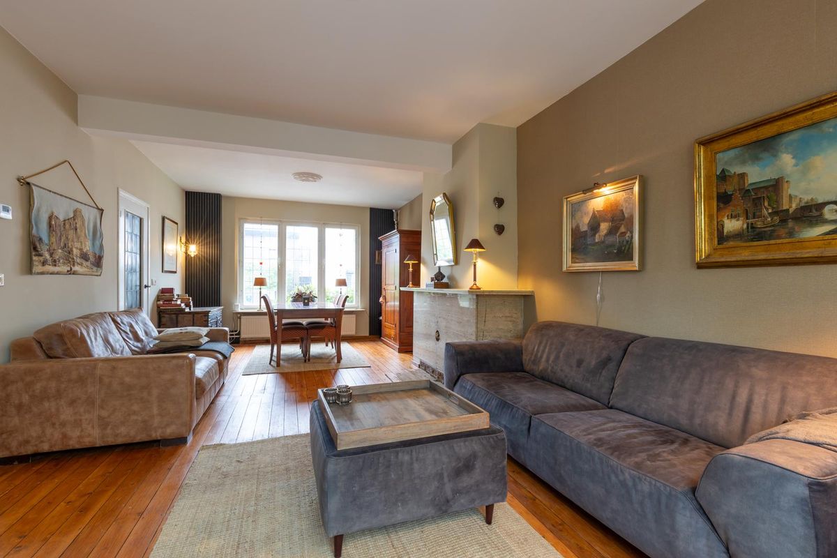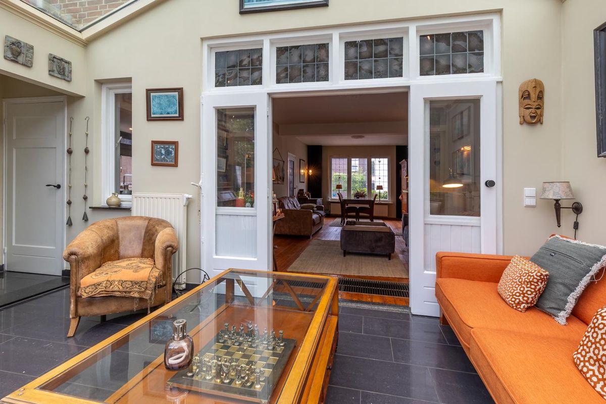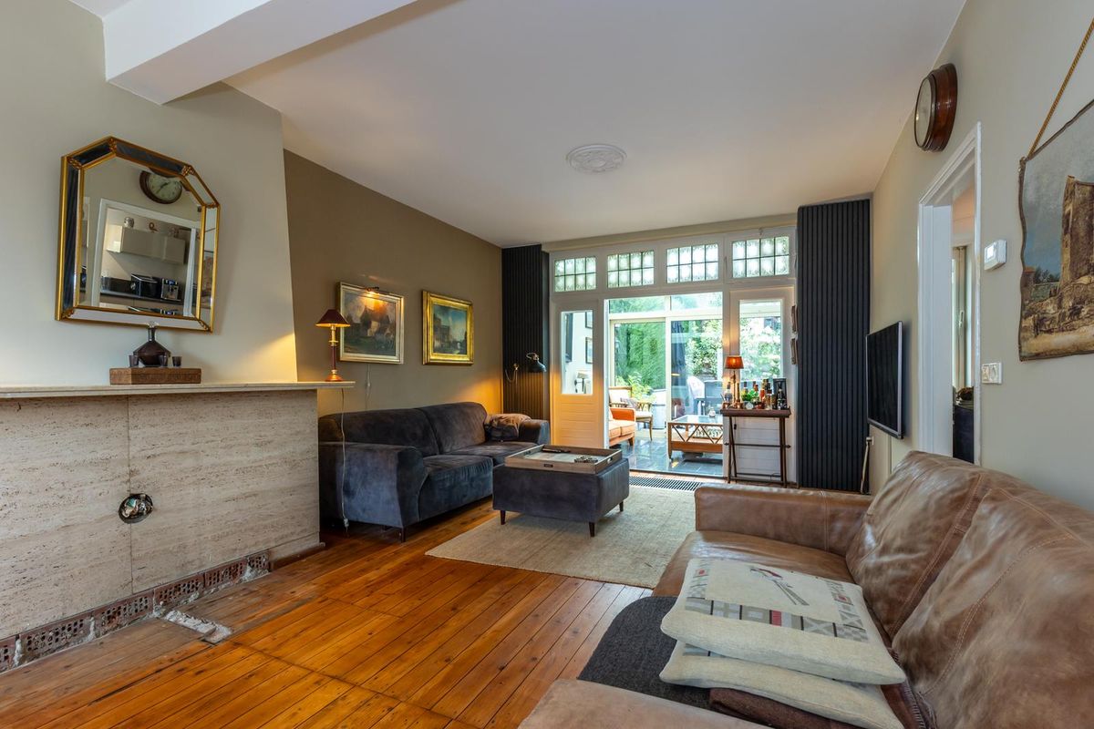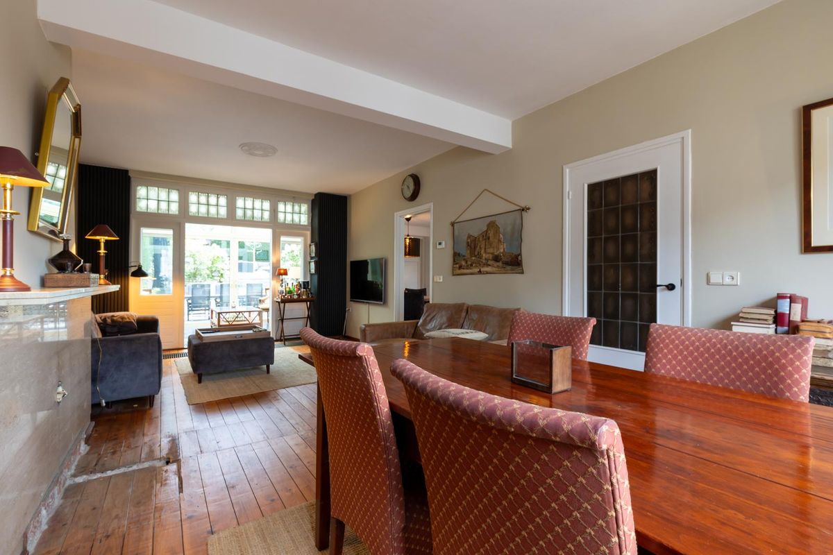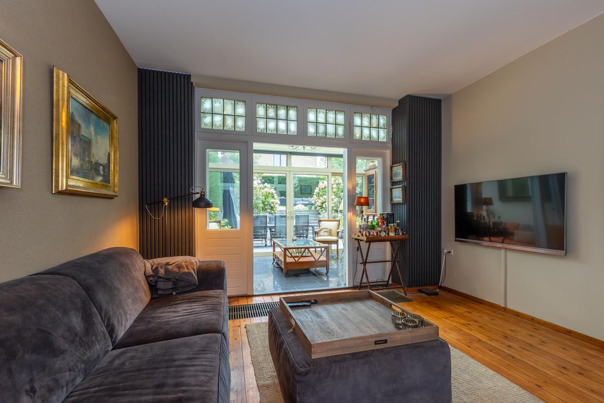 Ruime woonkamer (7.72*3.88m) met een fraaie houten vloer, convectorput en openslaande deuren naar de prachtige tuinkamer.