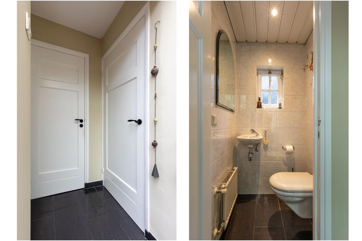 Portaal welke toegang geeft tot een volledig betegelde toiletruimte voorzien van een zwevend aangebracht closet en fonteintje, de bijkeuken alwaar de aansluitpunten voor witgoedapparatuur zijn en de tuinkamer.