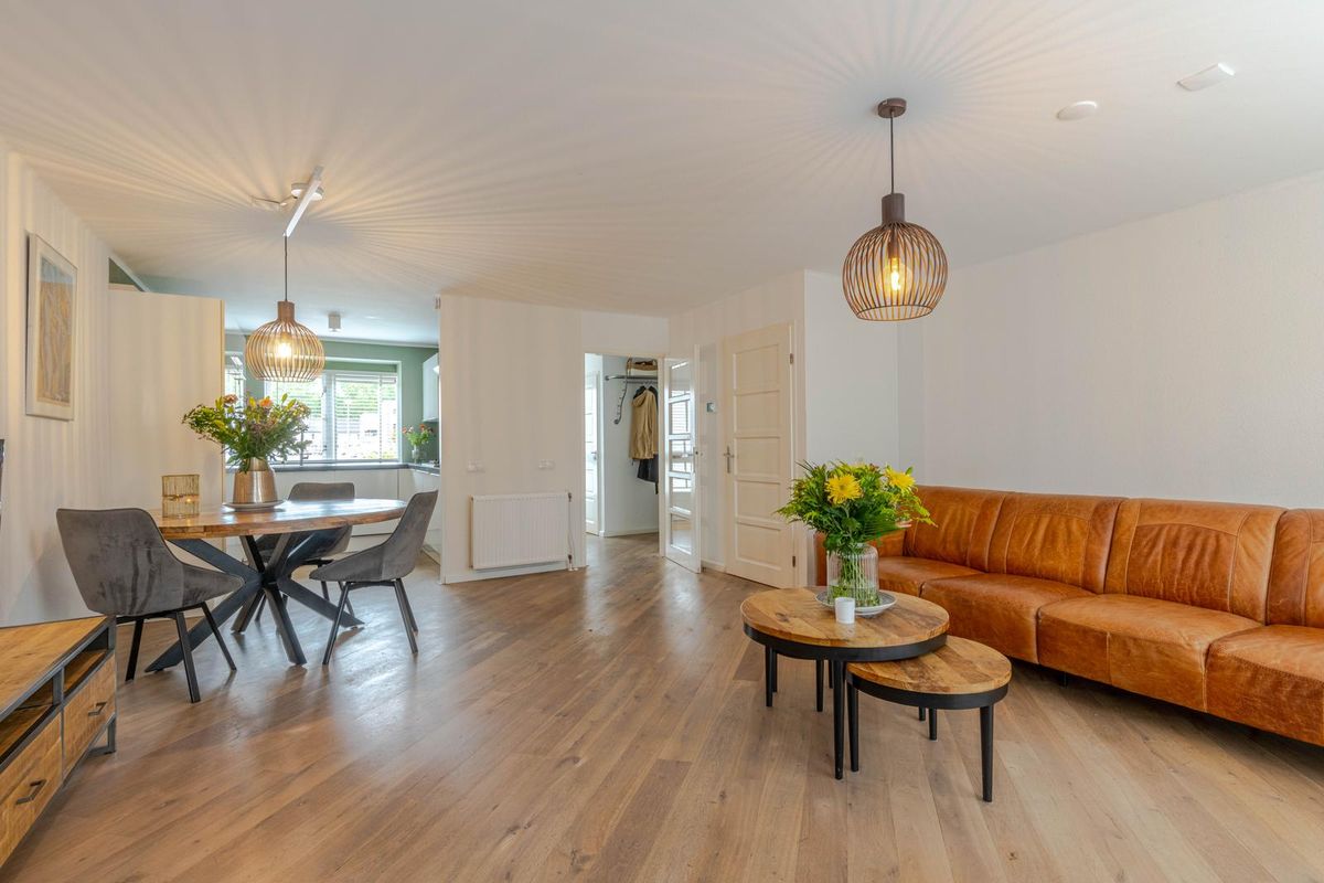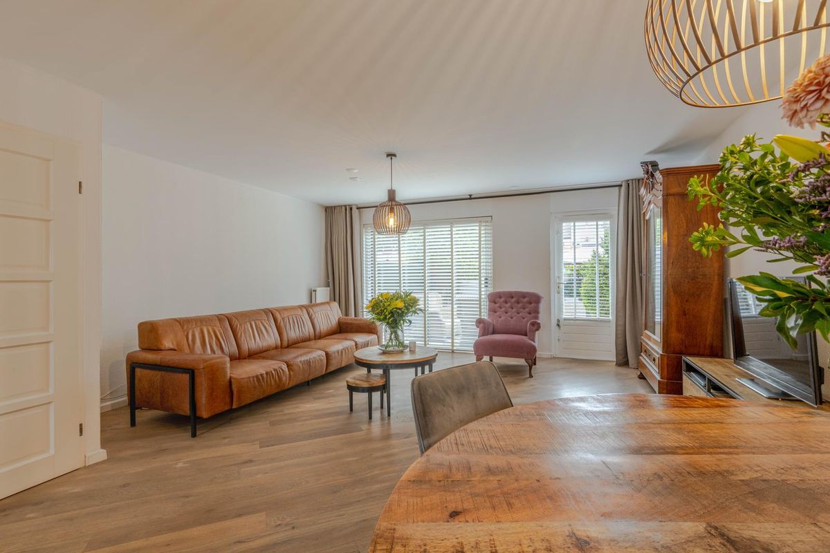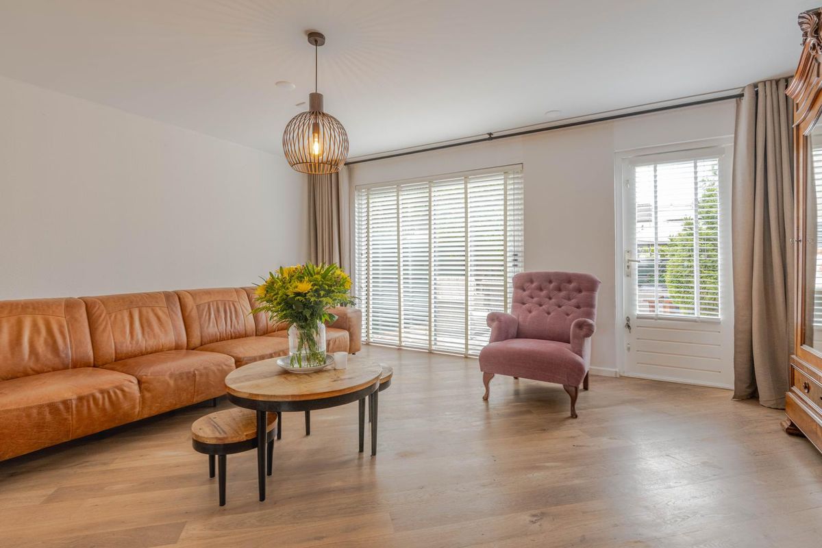 * Royale, tuingerichte woonkamer voorzien van eikenhoutenvloer, spachtelputz wanden, gestukt plafond, trapkast, open verbinding met de keukenruimte aan de voorzijde en een schuifpui en deur naar de achtertuin.
