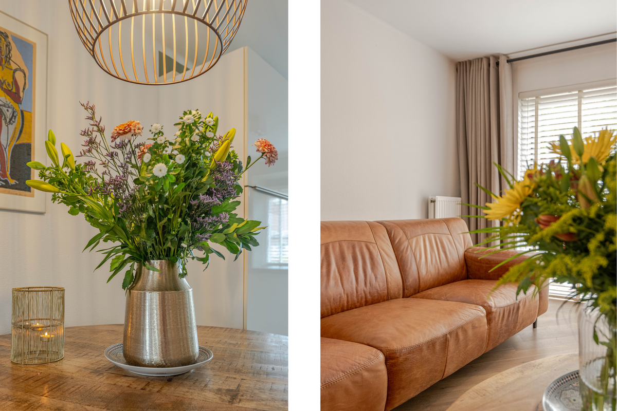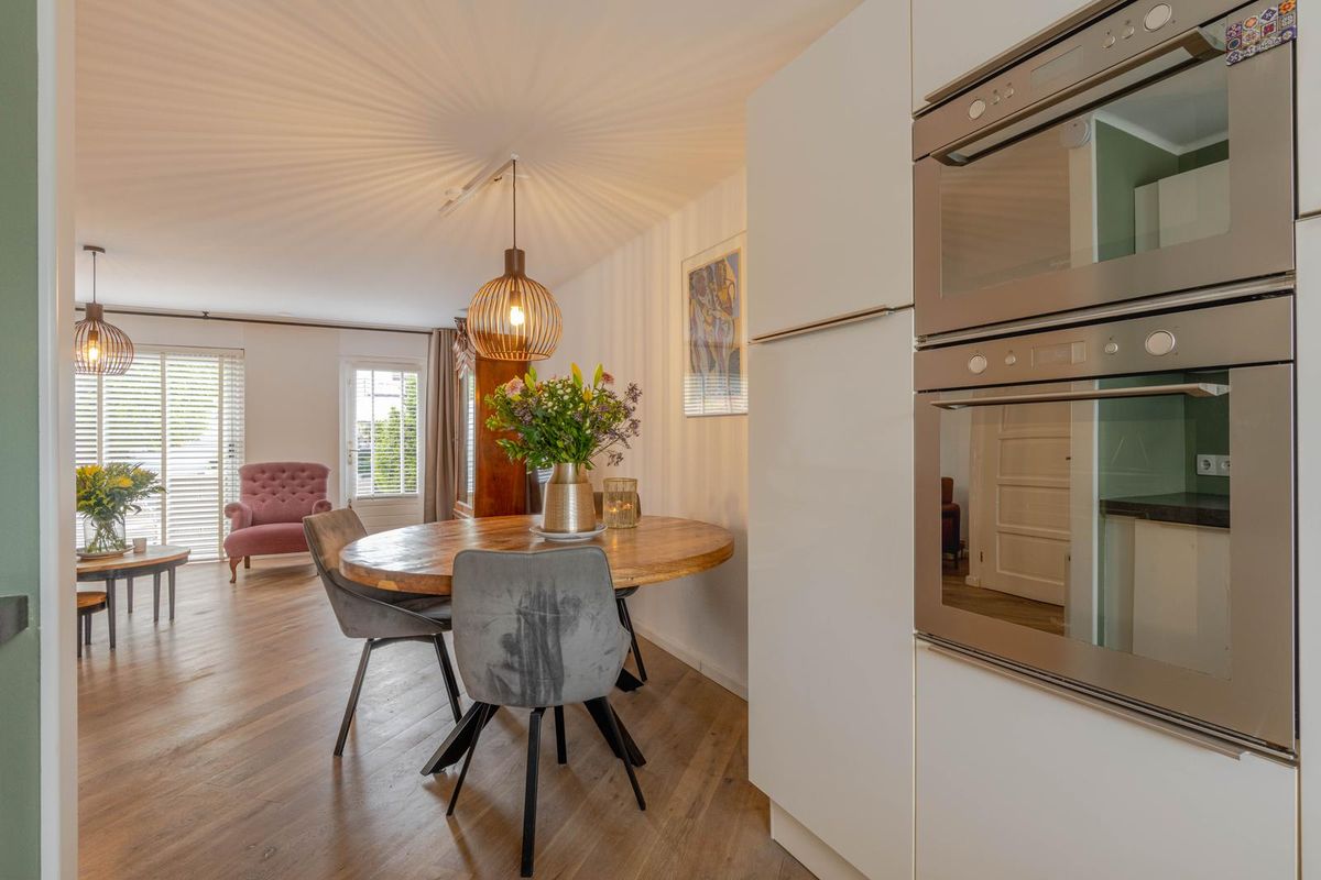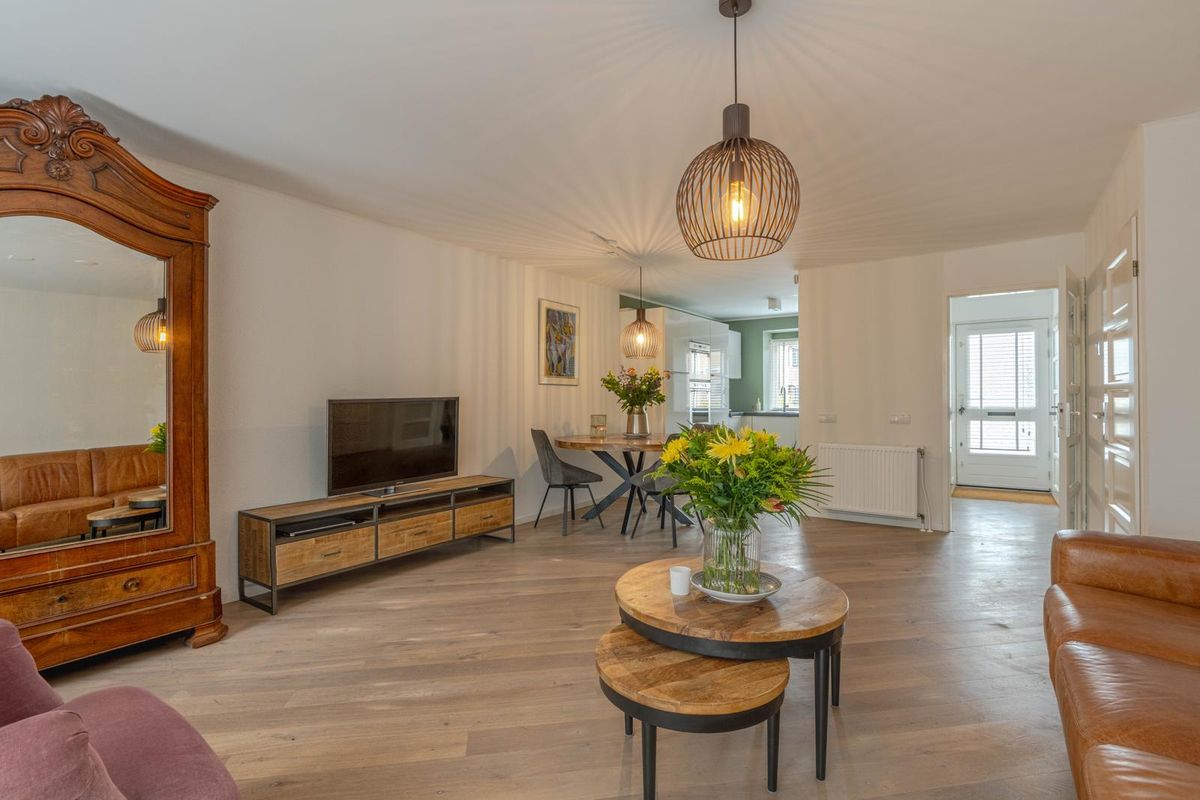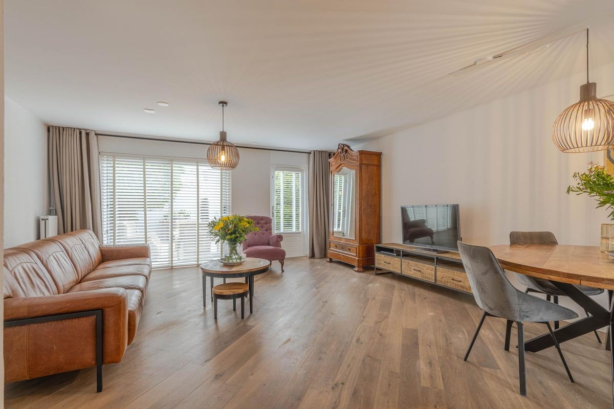 * Royale, tuingerichte woonkamer voorzien van eikenhoutenvloer, spachtelputz wanden, gestukt plafond, trapkast, open verbinding met de keukenruimte aan de voorzijde en een schuifpui en deur naar de achtertuin.