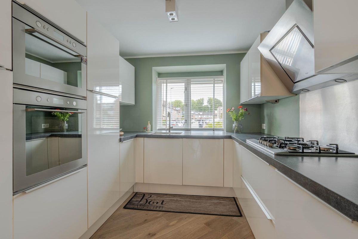 * Halfopen keuken voorzien van hoogglans inbouwkeuken in u-opstelling met apparatuur: 5-pits gaskookplaat, schouw-afzuigkap, vaatwasmachine (2024), koel-vriescombinatie, combimagnetron en oven.
