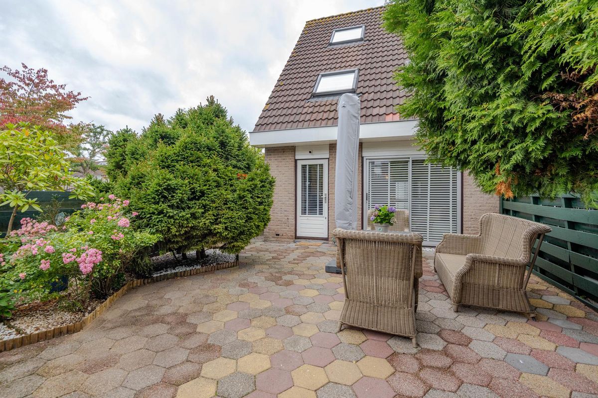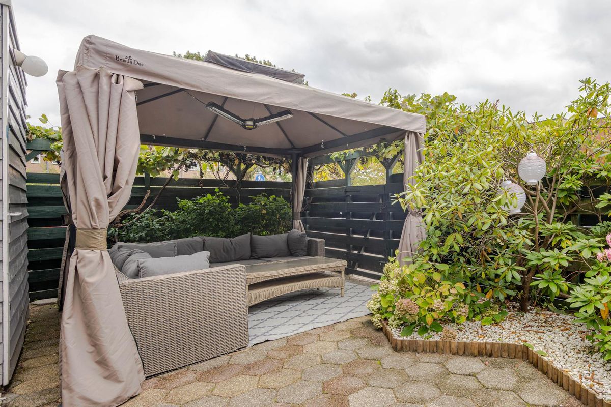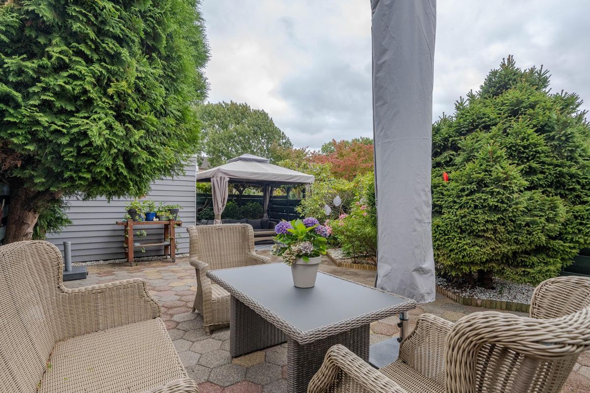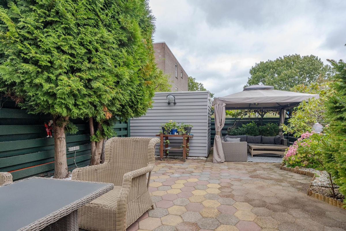 * Royale achter- (12.50 x 8.00 meter) en zij-tuin (2.50 meter breed) gelegen op het oosten, voorzien van bestrating, borders met beplanting, enkele bomen, achterom en houten schuur.