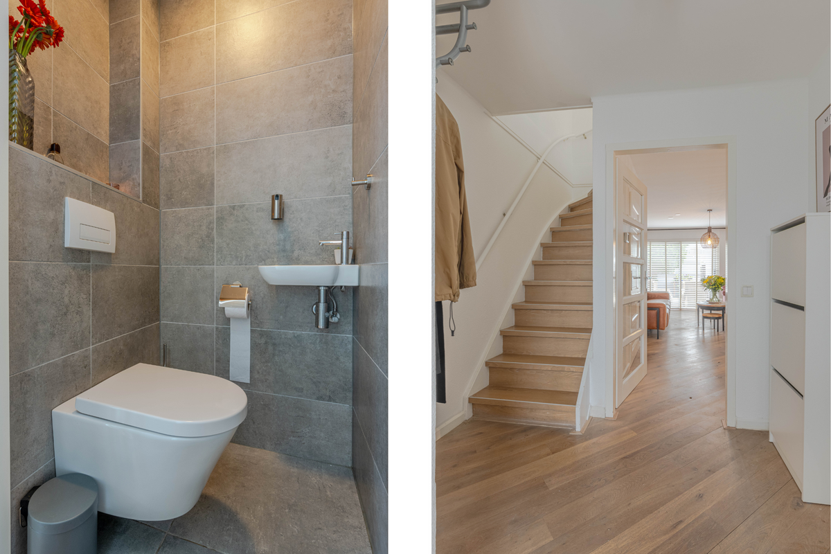 * Moderne toiletruimte met wandtoilet, fonteintje en betegeling.