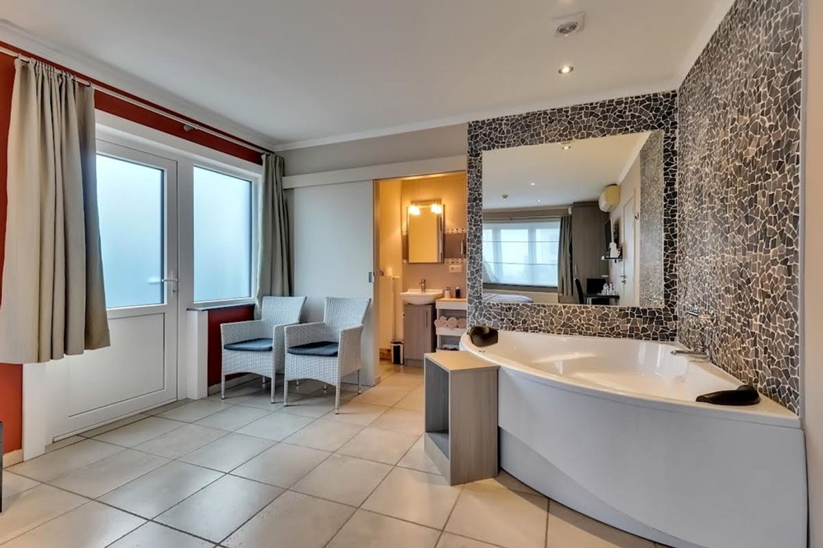- Slaapkamer twee (18m2) als relaxkamer ingericht met bijhorende badkamer (14m2) met wastafel, spiegel, jacuzzi bad, douche en toilet. Aansluitend is er een overdekt terras (14m2) en een privé buitenterras (10m2).
