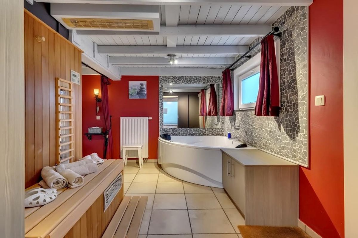 - Bedroom one (24m2) and bathroom with Jacuzzi bath, sink, mirror, shower, and toilet