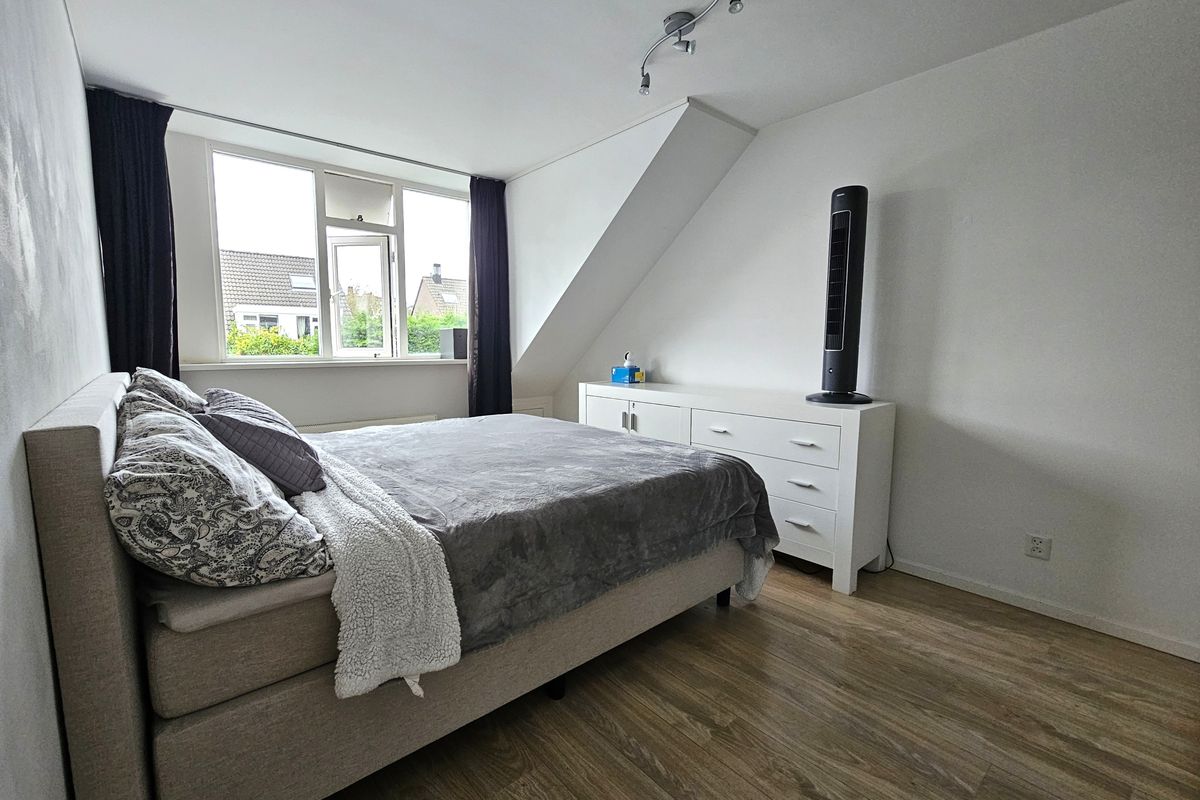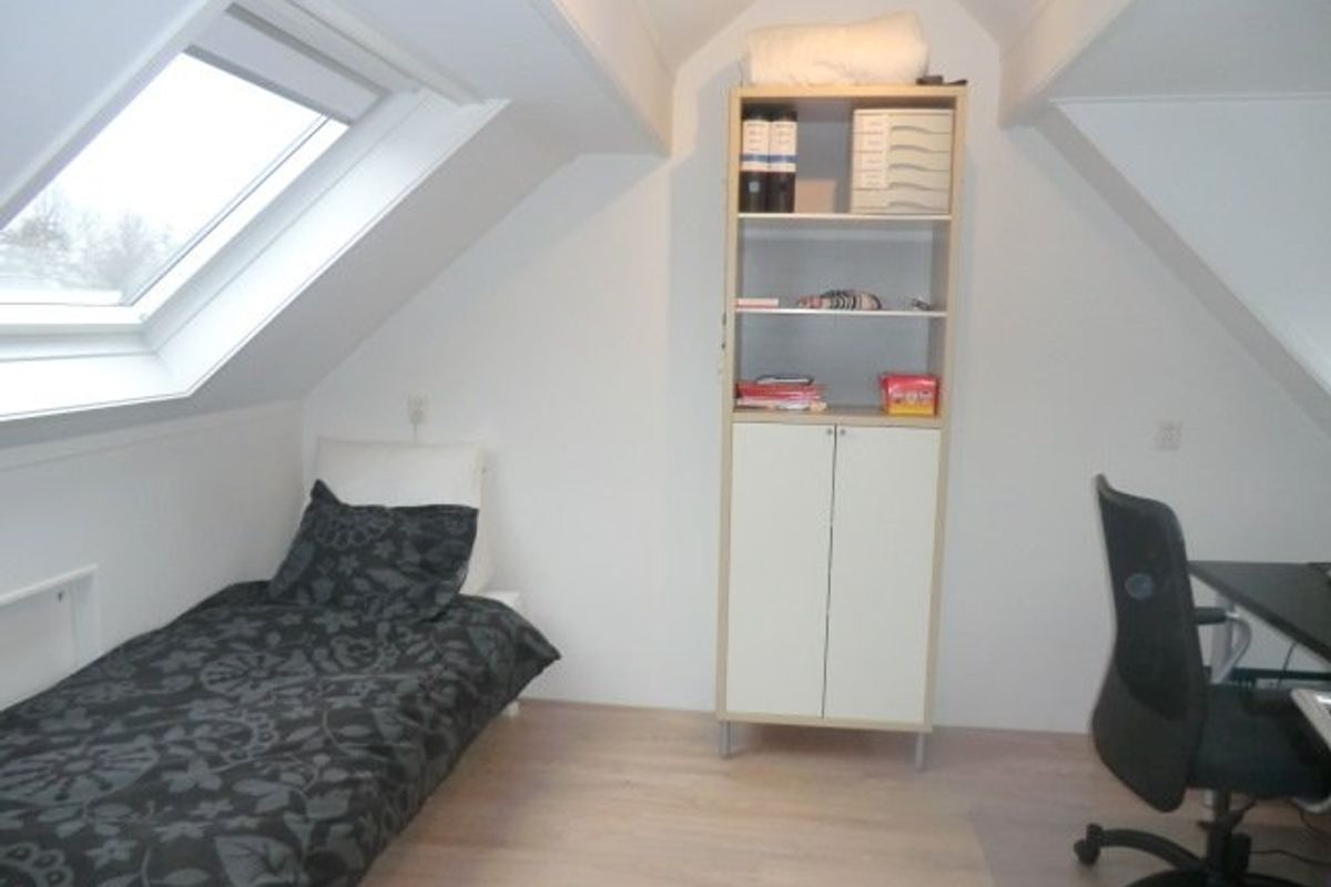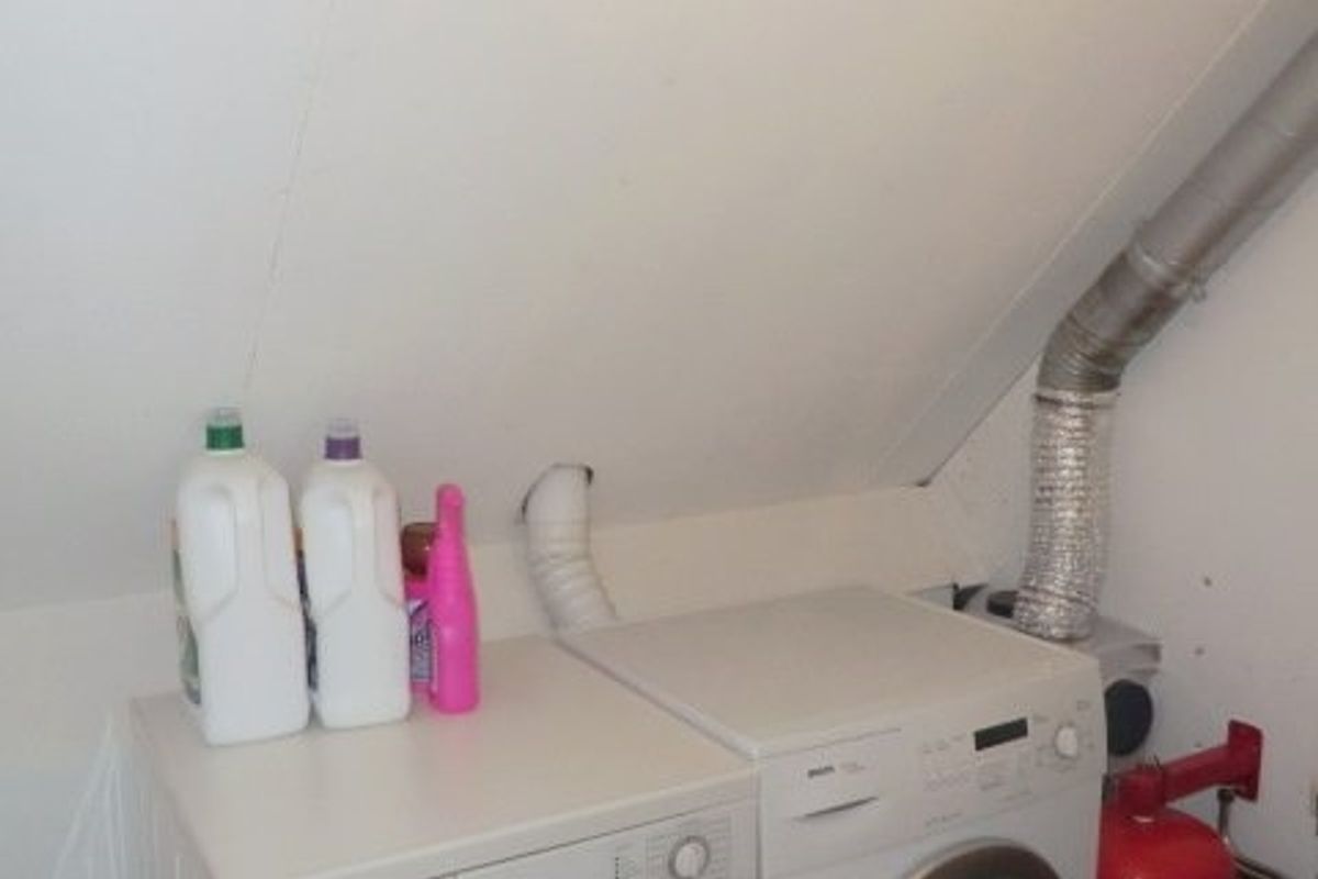 overloop, wasruimte met wasmachine en -droger, ruime slaapkamer (ca. 3,80 x 3,16 m) met veel bergruimte achter knieschotten.