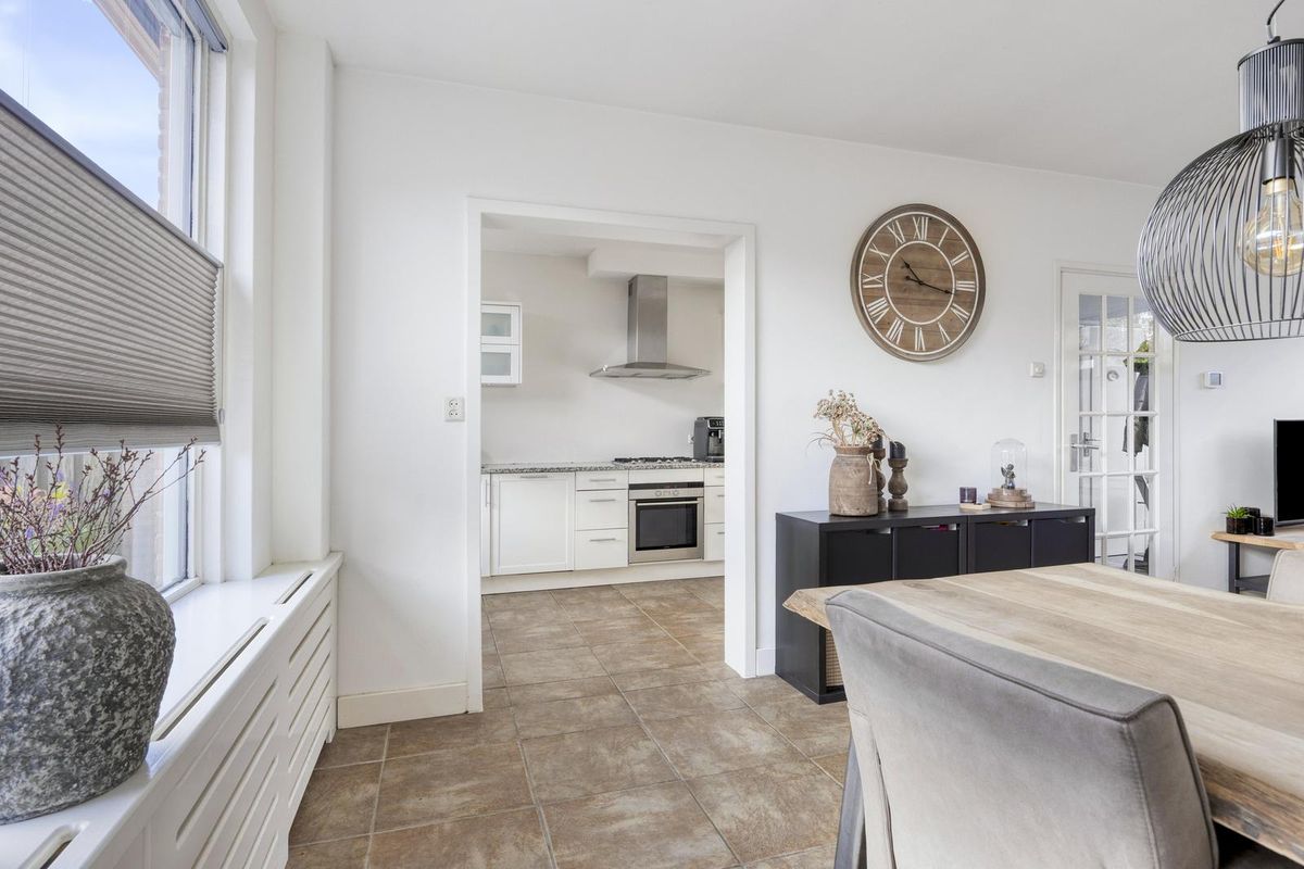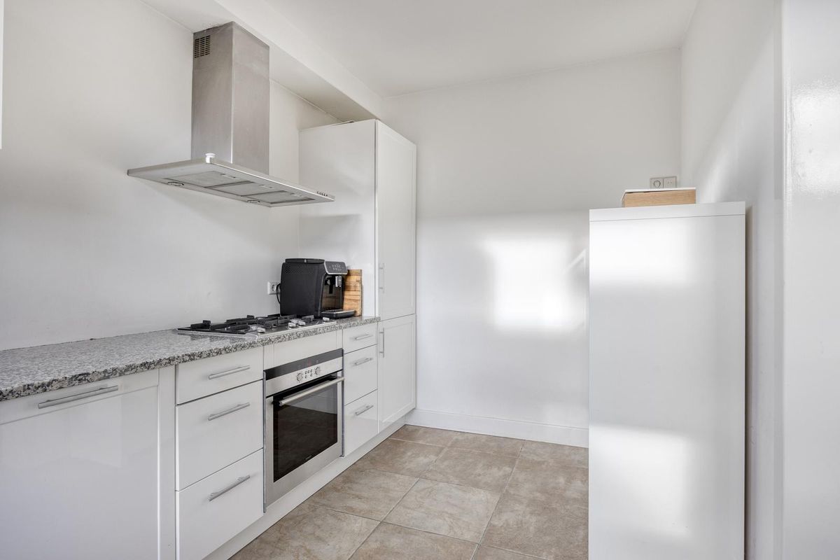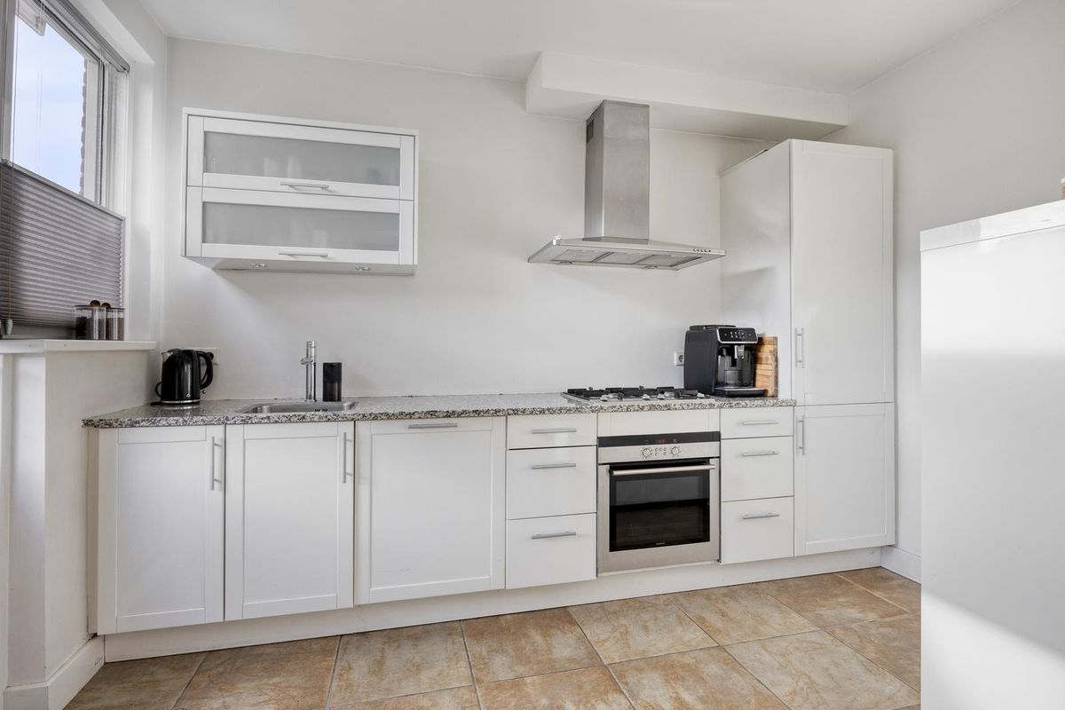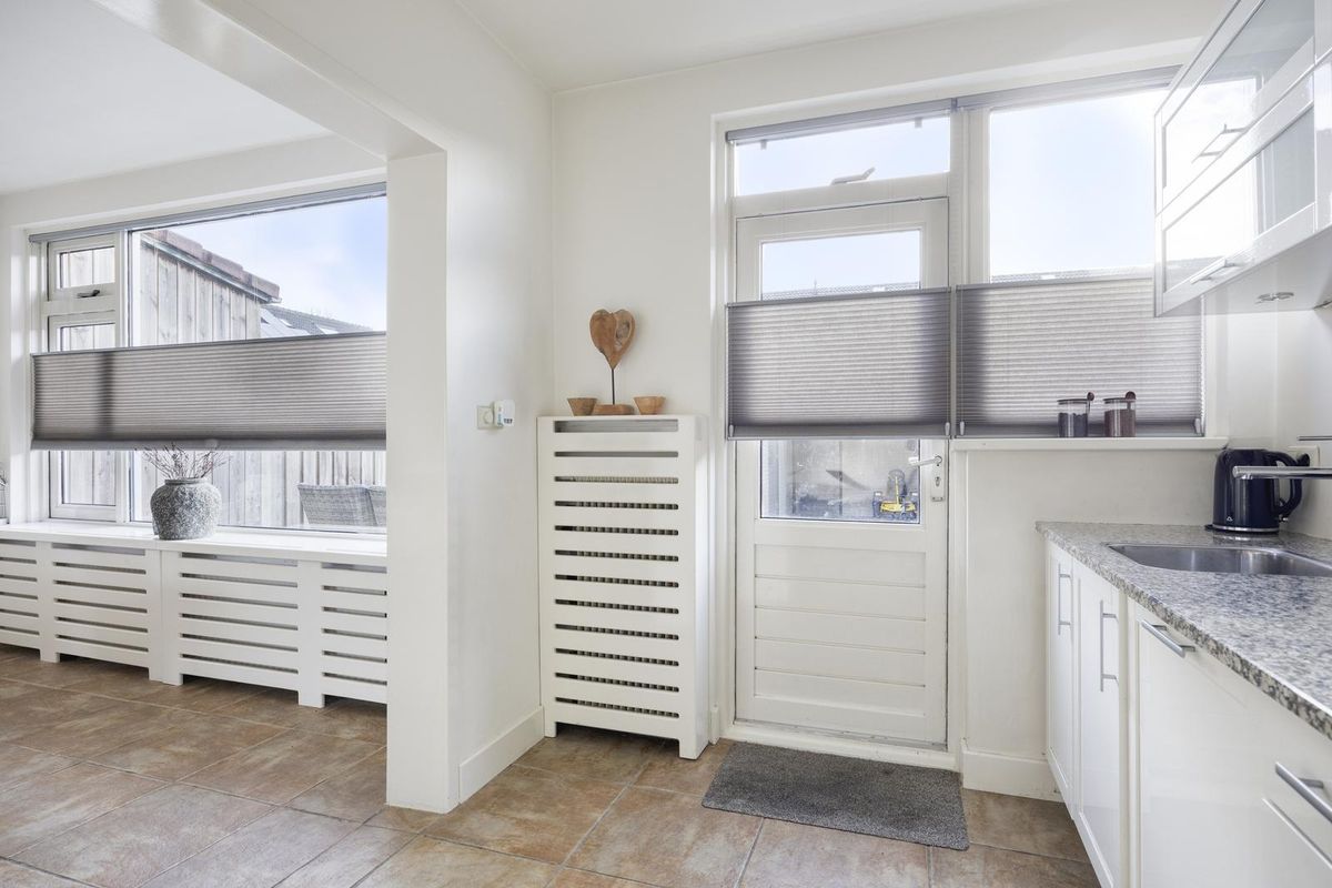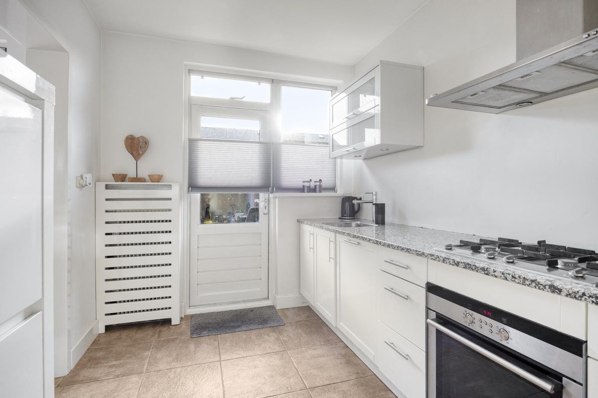 Vanuit de woonkamer betreedt u de halfopen keuken. De witte keuken, in rechte opstelling, beschikt over voldoende kastruimte. En met diverse inbouwapparatuur, zoals een 4-pits gaskookplaat, koelvries-combinatie, oven, vaatwasser en een afzuigkap, sta je hier dagelijks comfortabel te koken. De deur in de keuken geeft u direct toegang tot de achtertuin.