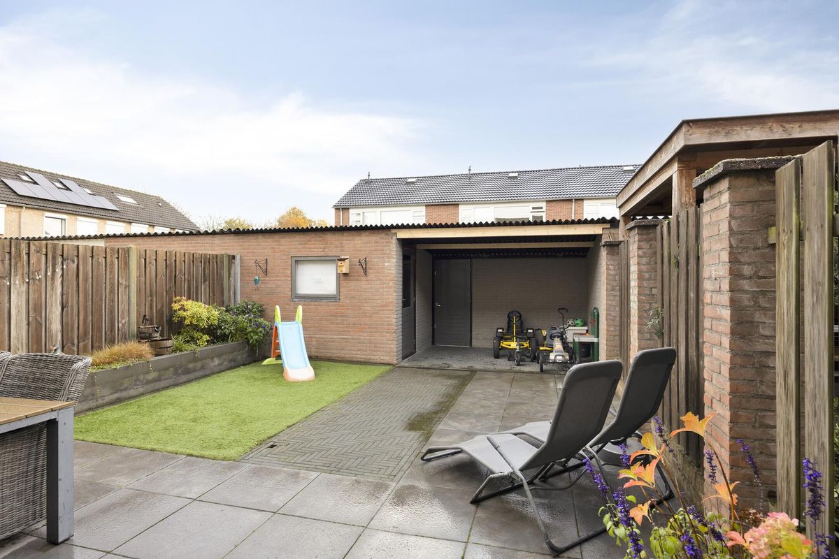 Vanuit de keuken en via een achterom is de achtertuin bereikbaar. De verzorgde tuin is gelegen op het zuidoosten. De tuin is onderhoudsvriendelijk doch sfeervol aangelegd met een combinatie van bestrating, kunstgras en borders. Achter in de tuin staat een praktische stenen berging met overkapping, ideaal voor het stallen van bijvoorbeeld de fietsen of het tuingereedschap.