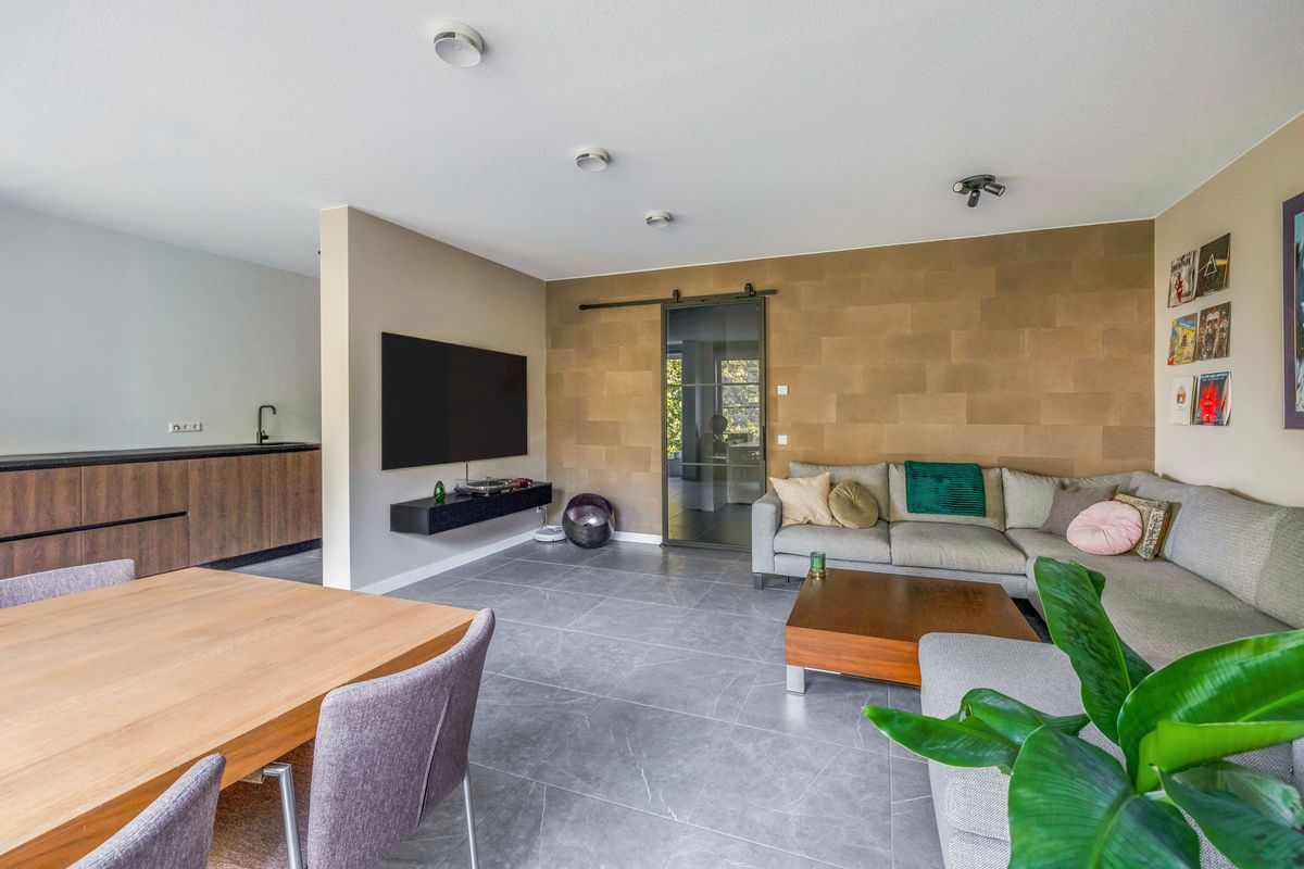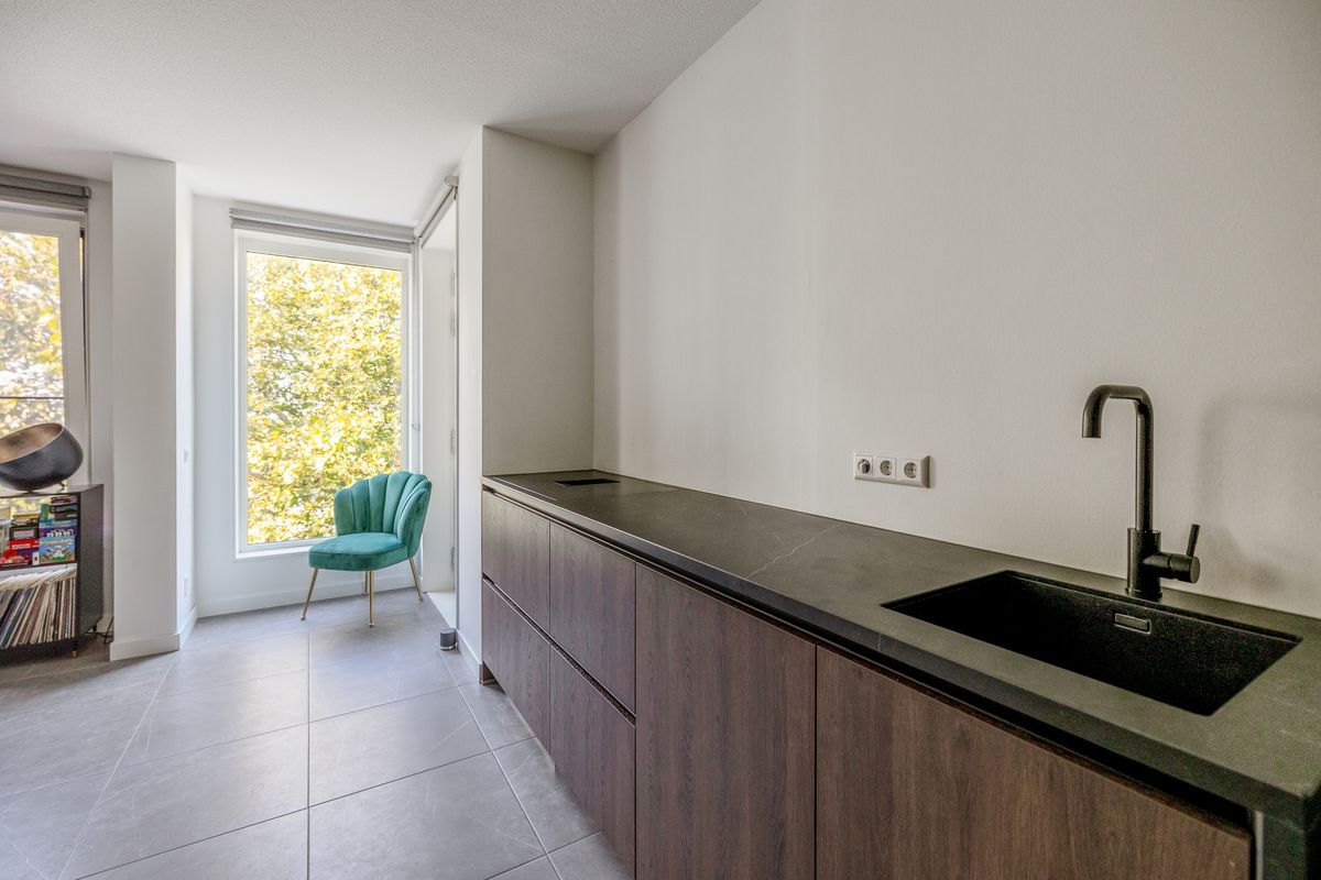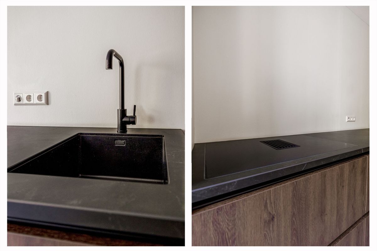 De moderne keuken is halfopen en uitgevoerd met houtkleurige, greep loze keukenkasten en een zwart stenen werkblad. Er is verschillende inbouwapparatuur aanwezig zoals een koelkast, vriezer, combi-oven, inductiekookplaat met geïntegreerde afzuiging, een vaatwasser en spoelbak met mengkraan.