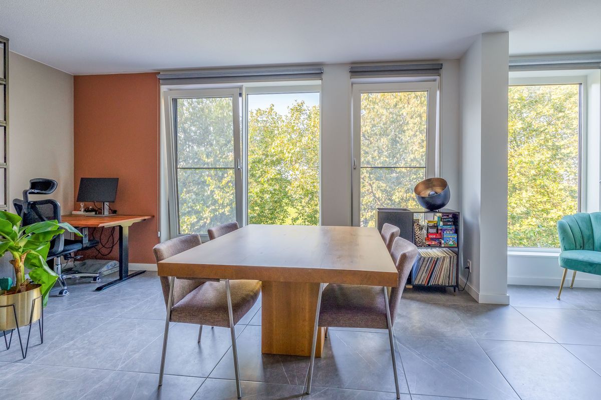 De woonkamer is aan de voorzijde gelegen en kijkt met grote raampartijen in kunststof kozijnen uit op de bomen en groene dijk van het Dakpark. Hierdoor heeft u het hele jaar door een prachtig groen uitzicht en veel privacy. Er ligt een mooie, gemêleerde tegelvloer en de wanden zijn strak afgewerkt. Er is voldoende ruimte voor een gezellige zithoek en een aparte eethoek en het balkon is hiervandaan toegankelijk.