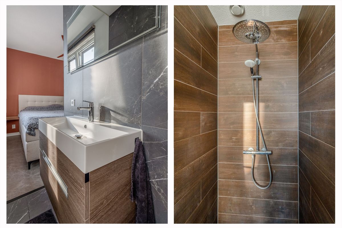 De badkamer ensuite is betegeld en heeft een luxe uitstraling. Er is een ruime inloopdouche, een wastafel met meubel en een grote spiegel. Het aparte toilet in de gang is in dezelfde luxe stijl afgewerkt.