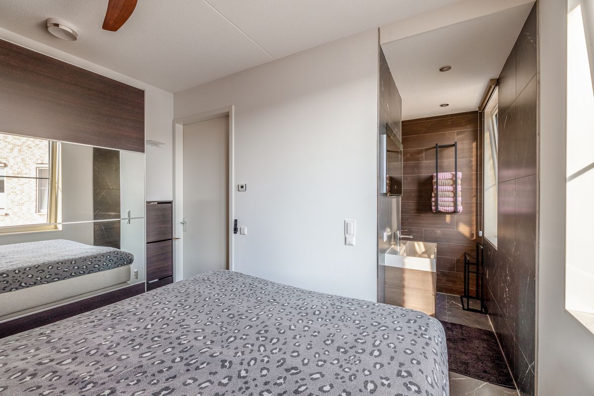 Middels de zwarte stalen deur met veel glas is de hal bereikbaar en vanuit daar de slaapkamer. De slaapkamer is aan de achterzijde gelegen en biedt genoeg ruimte voor een groot tweepersoonsbed en een kledingkast. De kamer is op dezelfde nette manier afgewerkt als de woonkamer.