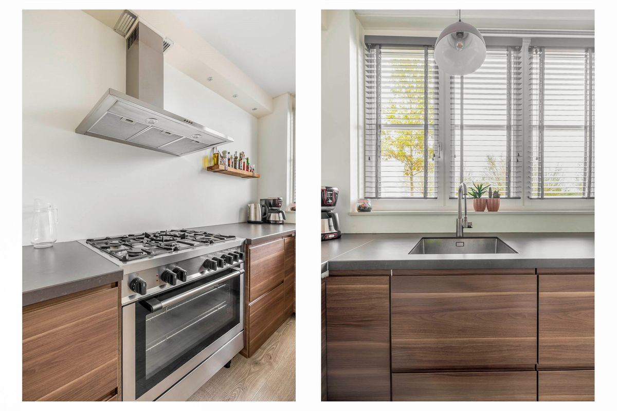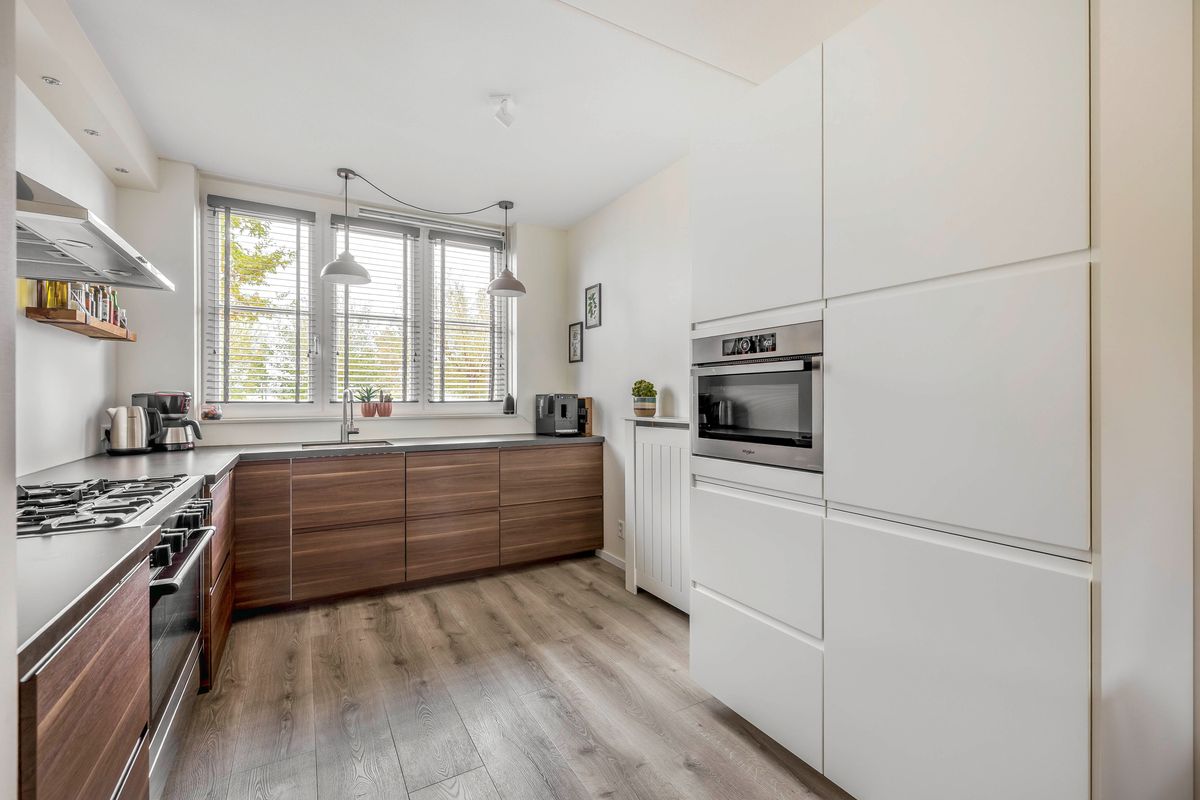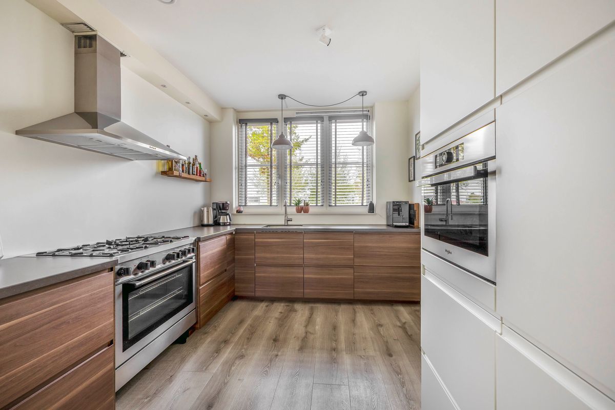 De luxe keuken aan de voorzijde van het huis is opgesteld in een ruime hoekopstelling. Een deel van de apparatuur is ingebouwd in de vrijstaande apparatenkast, waaronder de koel-vriescombinatie en de combimagnetron. Onder het composieten werkblad vindt u een fraai fornuis en een vaatwasser. De kleurstelling bestaat uit witte fronten bij de apparatenkast en bruine kastfronten met houtdecor aan de onderzijde. De keuken heeft een oppervlakte van circa 10,8 m².