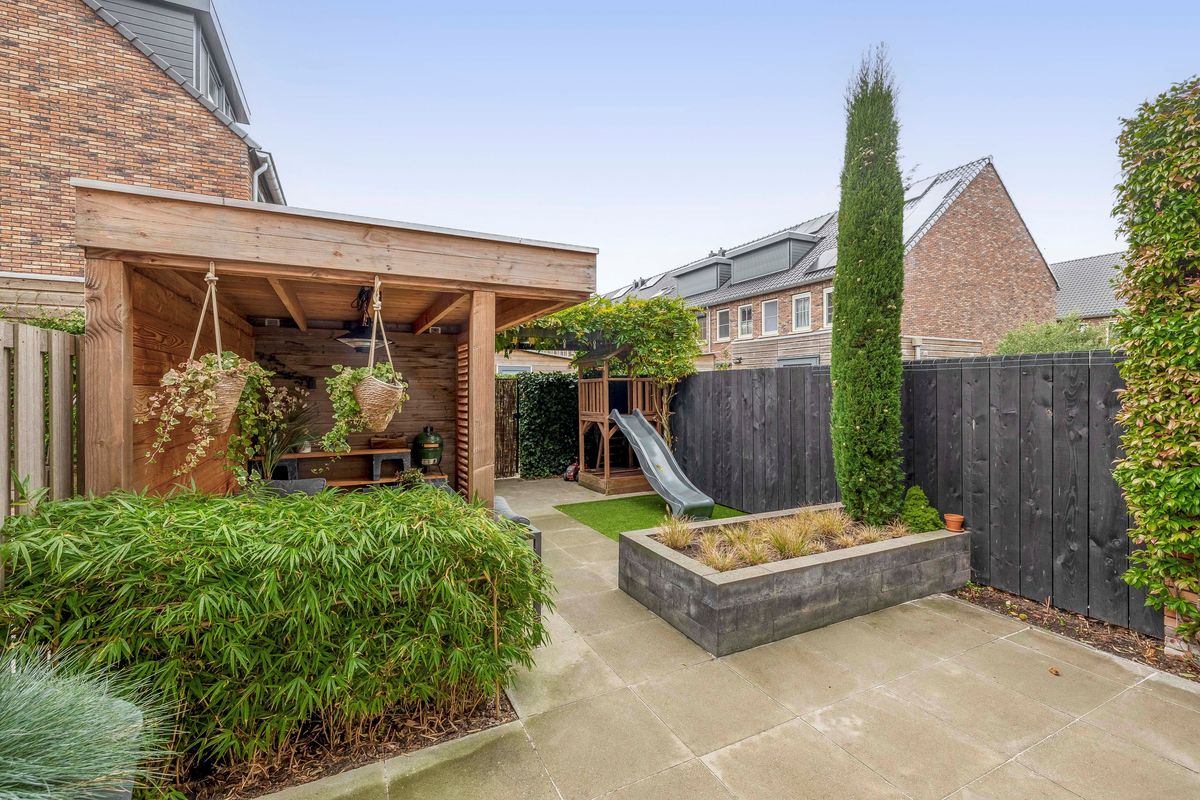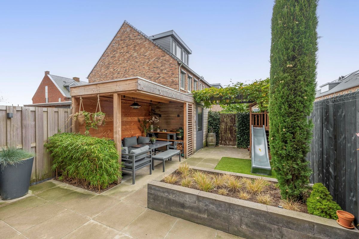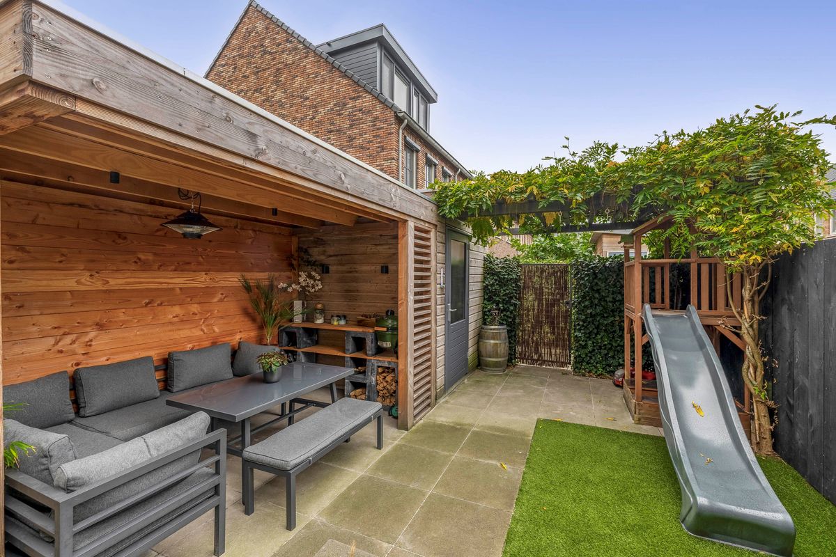 De openslaande tuindeuren geven toegang tot de zonnige achtertuin, die fraai is aangelegd met een veranda waar het heerlijk vertoeven is. Daarnaast is er een stukje kunstgras onder de glijbaan en zijn er vaste planten in verhoogde borders. Uiteraard ontbreekt de berging niet, en via de achterom bereikt u het openbare gebied.