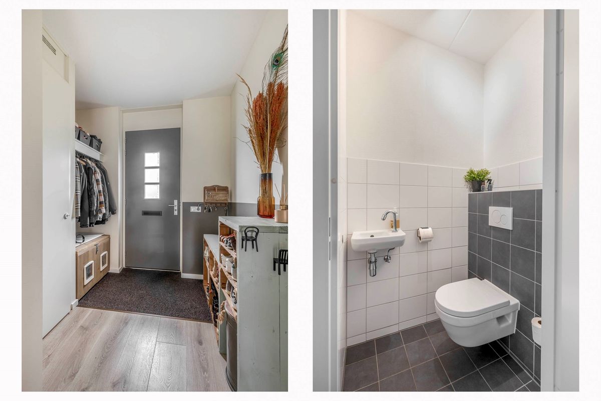 Via de verzorgde voortuin en overkapte entree komt u binnen in de woning. Achter de voordeur bevindt zich de hal met een uitgebreide meterkast, garderobenis, trapopgang naar de eerste verdieping en een moderne toiletruimte met fonteintje. De hal is voorzien van een laminaatvloer die doorloopt in de woonkamer en keuken. De standaard haldeur is vervangen door een luxe variant in zwarte kleur.