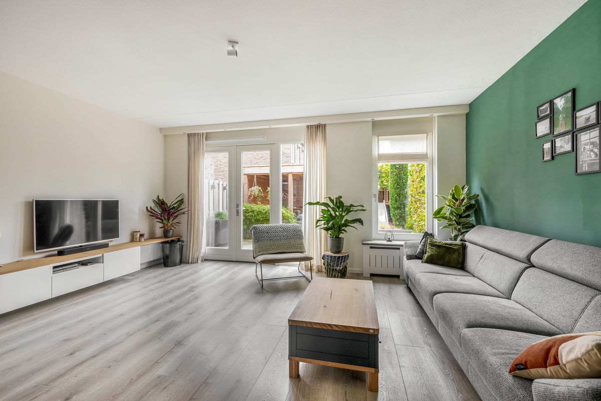 Keurig afgewerkte woonkamer met nette vloer, gladde wanden en openslaande deuren