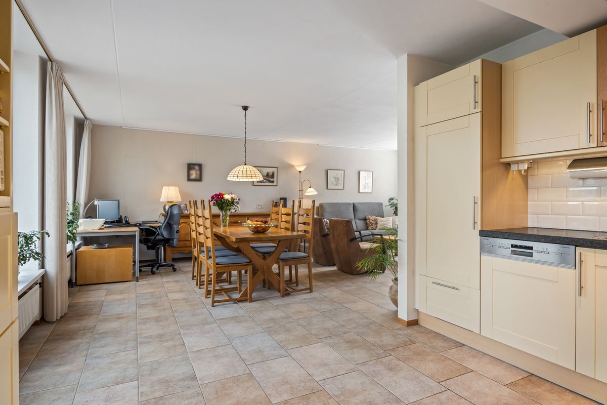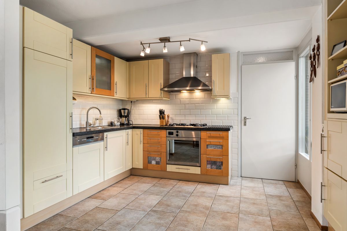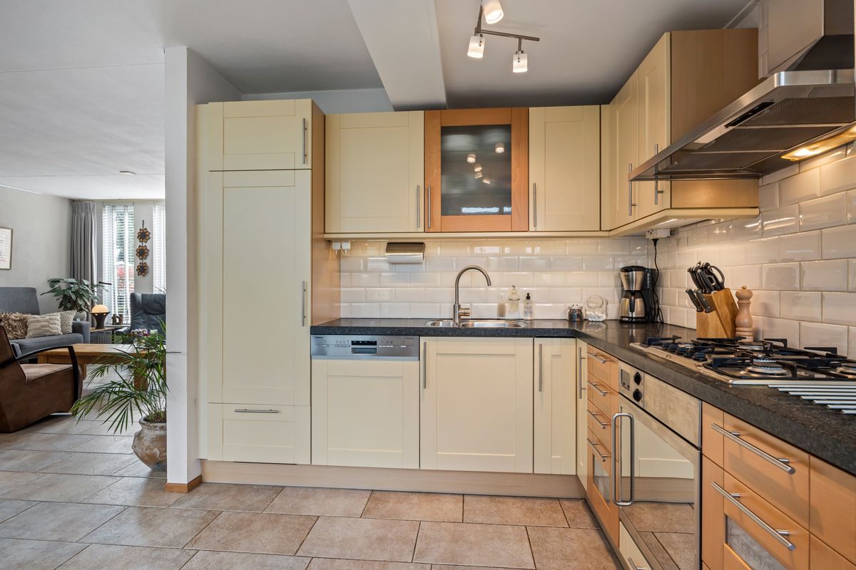 De keuken is geplaatst in een hoekopstelling en heeft een open verbinding met de woonkamer. De keuken is voorzien van een 5-pits gaskookplaat, een afzuigkap, een vaatwasser, een oven, een koelkast en diverse boven-en onderkasten. Aansluitend heb je toegang tot de bijkeuken.