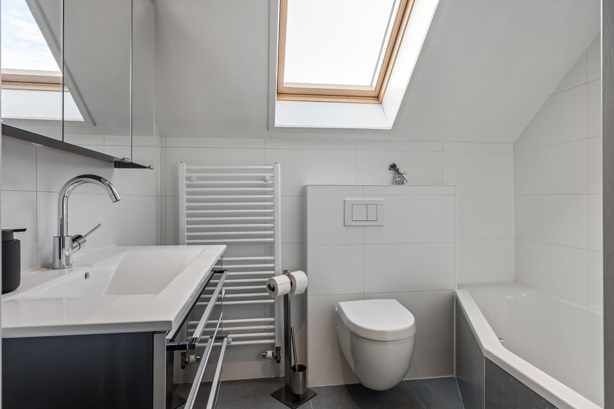 De moderne badkamer is volledig betegeld en voorzien van een wastafel met meubel, wandcloset, bad/douche combinatie, een handdoekradiator en een groot Velux-dakraam voor voldoende daglichttoetreding.
