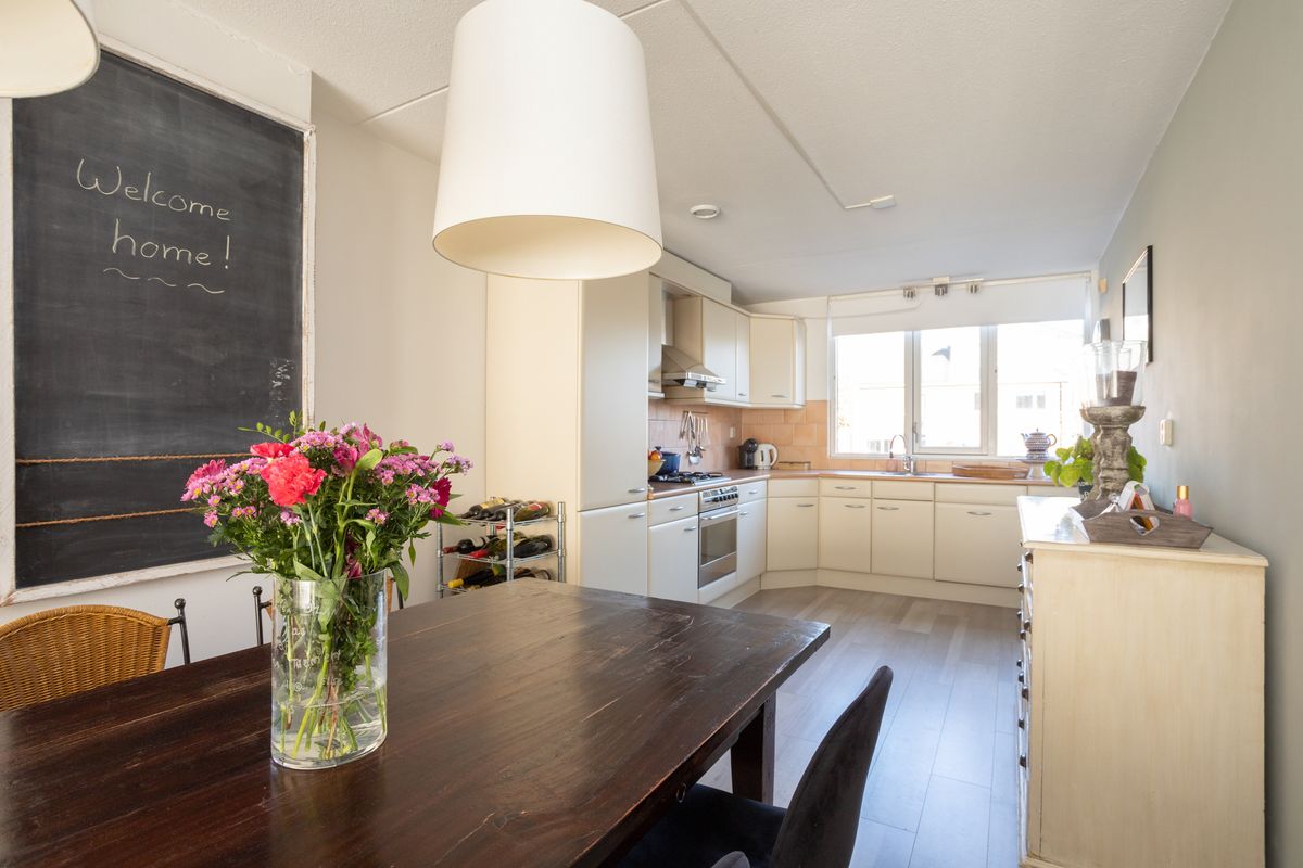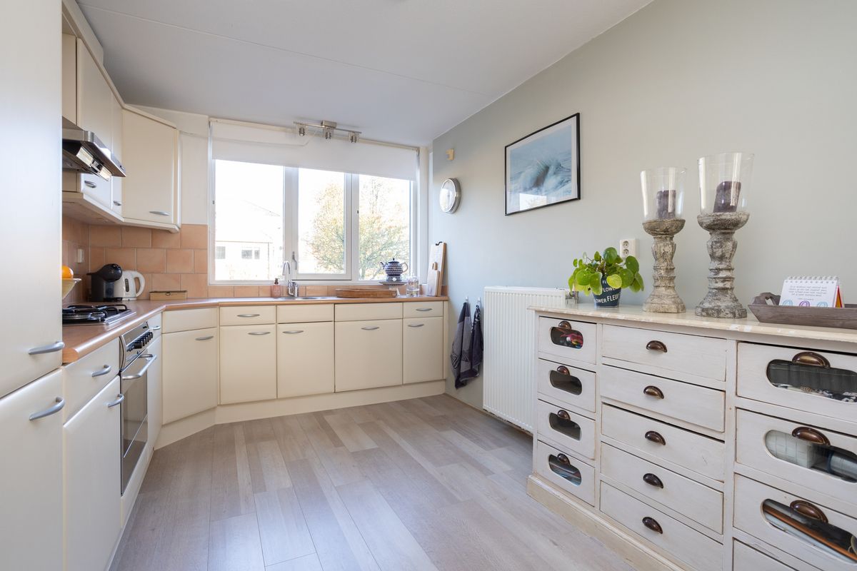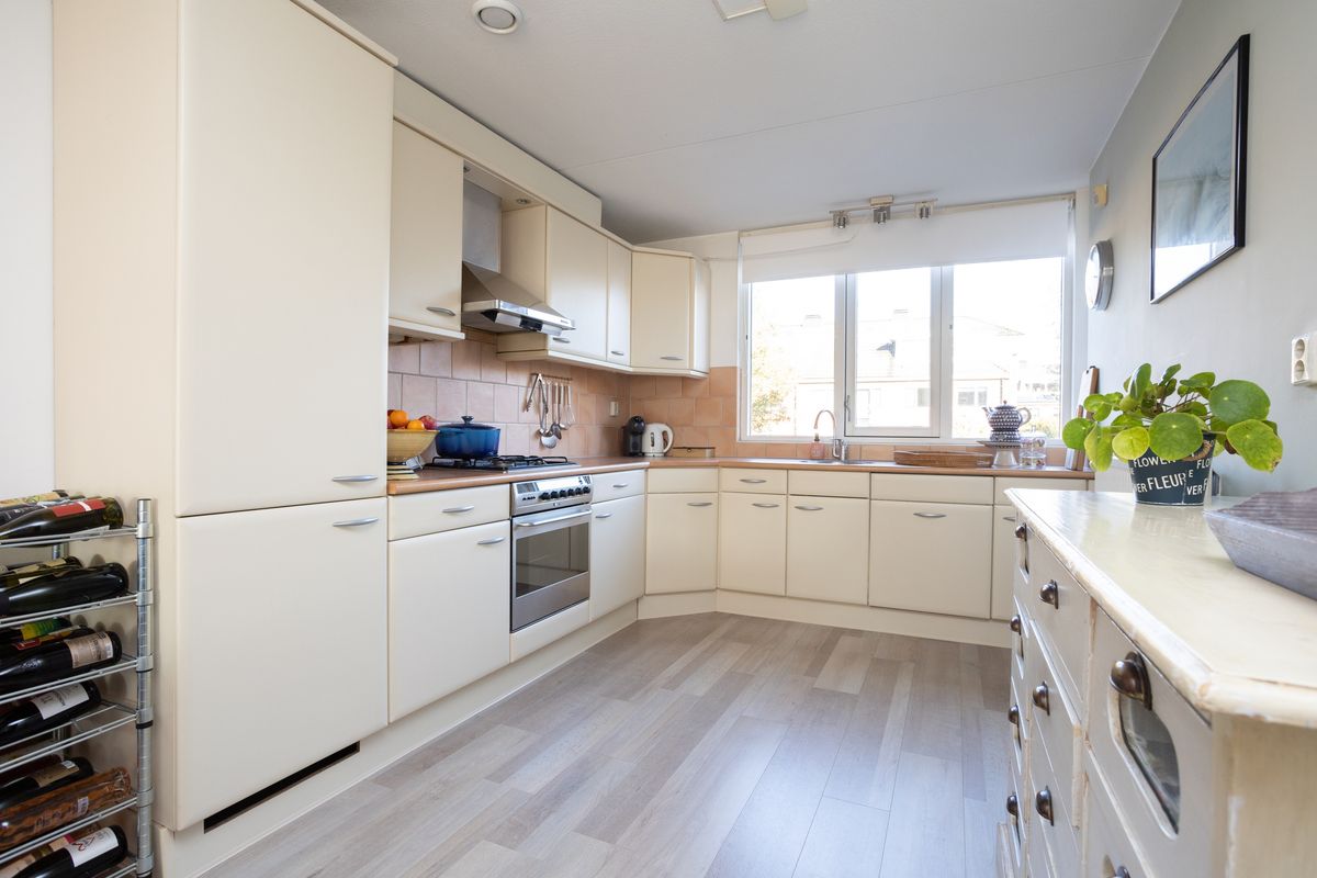 Entree, toilet met fonteintje, trap naar beneden naar de inpandige garage. Vanuit de entree toegang tot de heerlijke woonkamer. Wat direct opvalt naast de prachtige raampartijen is het hoge plafond, wat een ruimte en wat een licht. Op de vloer ligt eiken. Vanuit het woongedeelte een paar treden omhoog om in de ruime eetkamer te komen. De keuken beschikt over een 4 pits gaskookplaat, oven en een vaatwasser. Het geheel is afgewerkt met een kunststof blad. Vanuit de keuken heeft u prachtig vrij uitzicht.