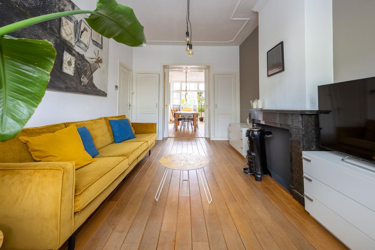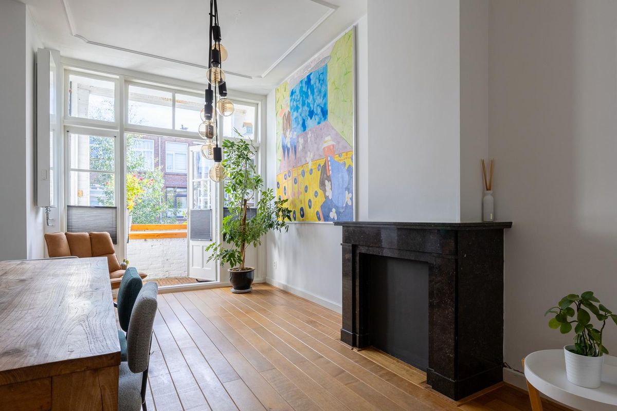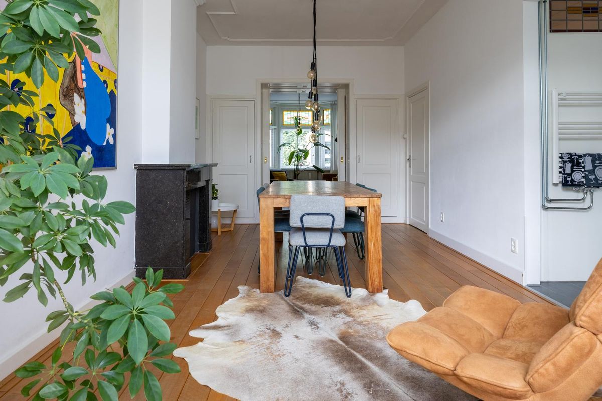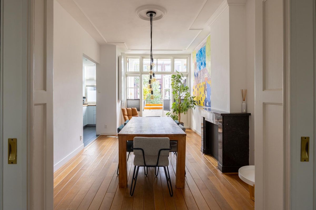 De lichte woonkamer heeft dankzij de hoge plafonds met originele ornamenten en de karakteristieke erker een prachtige, ruimtelijke uitstraling met veel allure. Het woon- en eetgedeelte worden op stijlvolle wijze van elkaar gescheiden door de originele en suite schuifdeuren met glas in lood en ingebouwde kasten aan beide zijden. De sfeervolle schouwen maken het geheel compleet en geven de kamer extra karakter. Vanuit de achterkamer openslaande deuren naar het balkon, dat grotendeels gelegen is op het oosten. Hier kunt u in de ochtend heerlijk genieten van de zon en van een ontspannen moment met een kop koffie.
