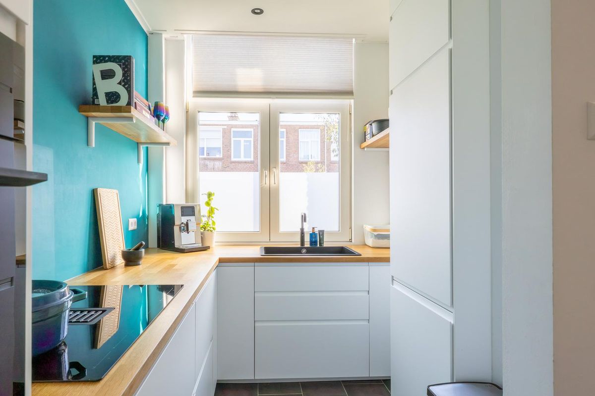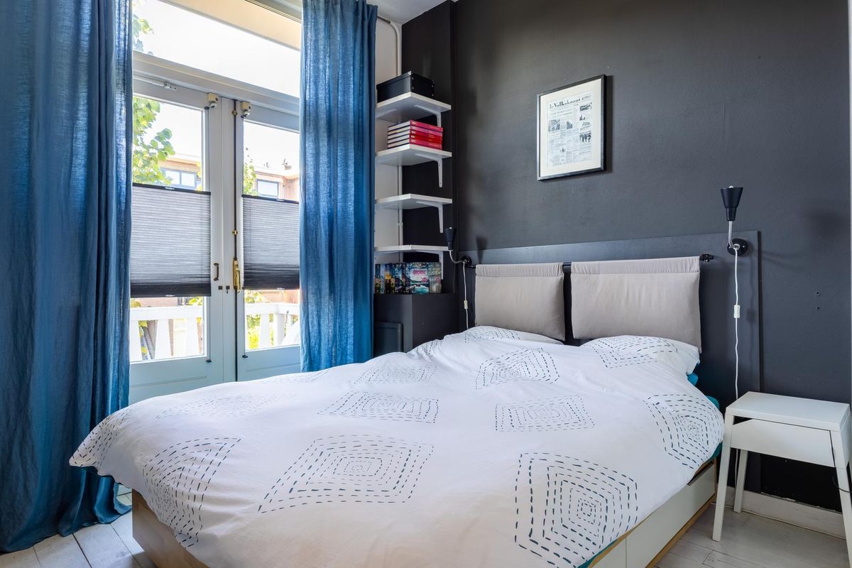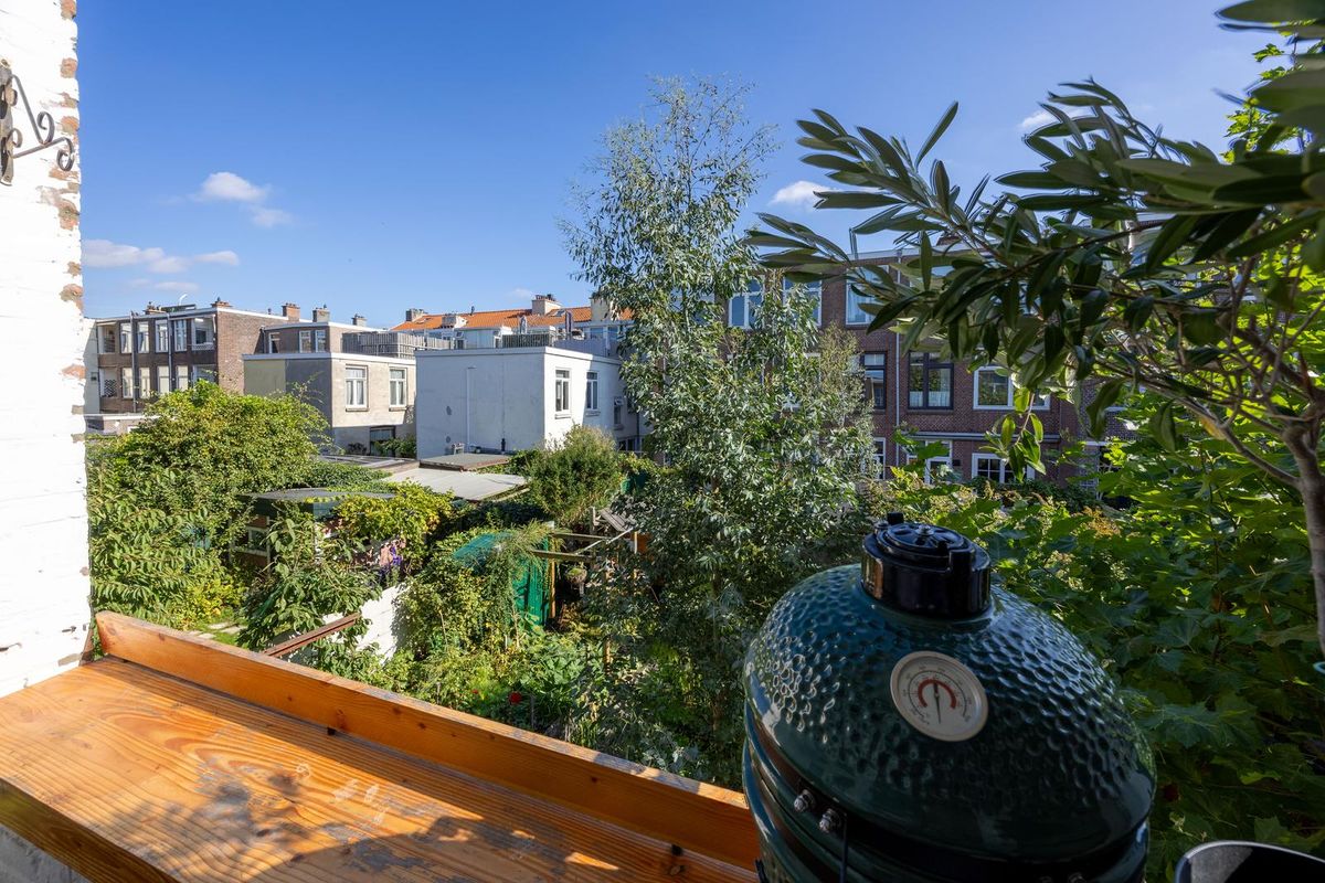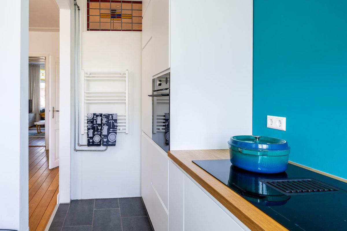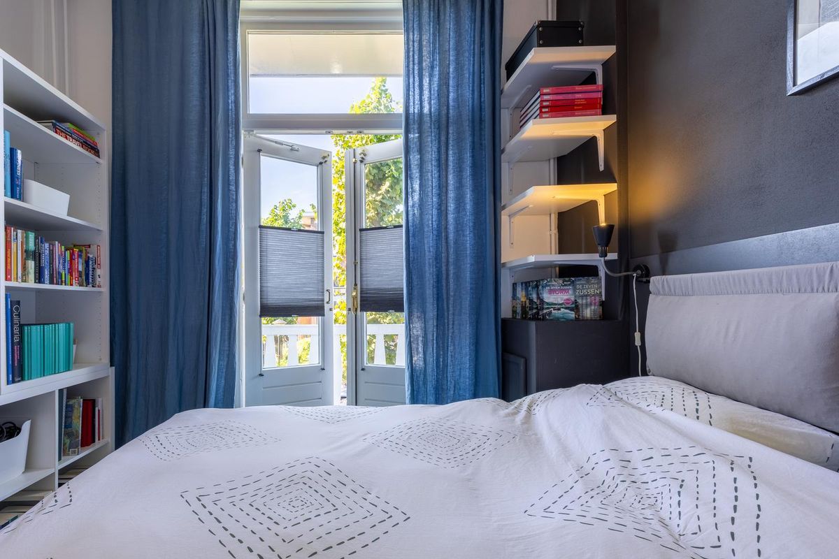 De lichte woonkamer heeft dankzij de hoge plafonds met originele ornamenten en de karakteristieke erker een prachtige, ruimtelijke uitstraling met veel allure. Het woon- en eetgedeelte worden op stijlvolle wijze van elkaar gescheiden door de originele en suite schuifdeuren met glas in lood en ingebouwde kasten aan beide zijden. De sfeervolle schouwen maken het geheel compleet en geven de kamer extra karakter. Vanuit de achterkamer openslaande deuren naar het balkon, dat grotendeels gelegen is op het oosten. Hier kunt u in de ochtend heerlijk genieten van de zon en van een ontspannen moment met een kop koffie.
