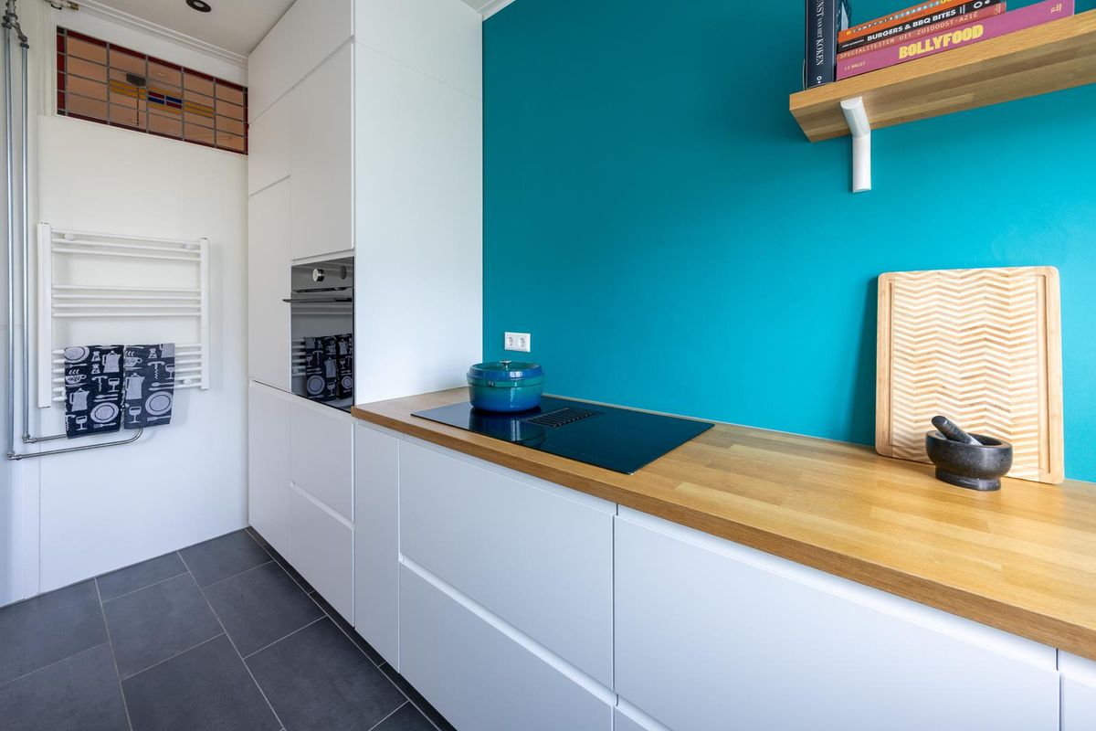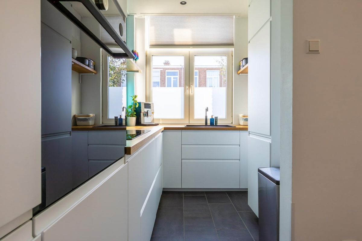 Aan de achterzijde bevindt zich de moderne open keuken (2022) die voorzien is van een vaatwasser, stoomoven, koelkast, vriezer, 4-pits inductiekookplaat met flexzones en ingebouwde afzuiging en volop bergruimte.