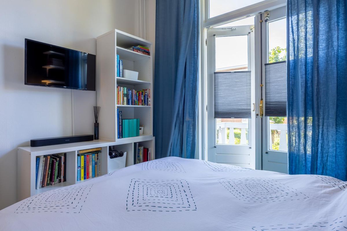 De hoofdslaapkamer met openslaande deuren naar een zonnig balkon (zuidwesten), ligt aan de voorkant van het appartement.