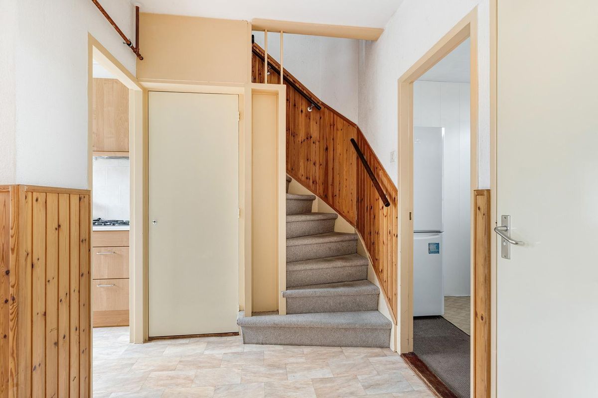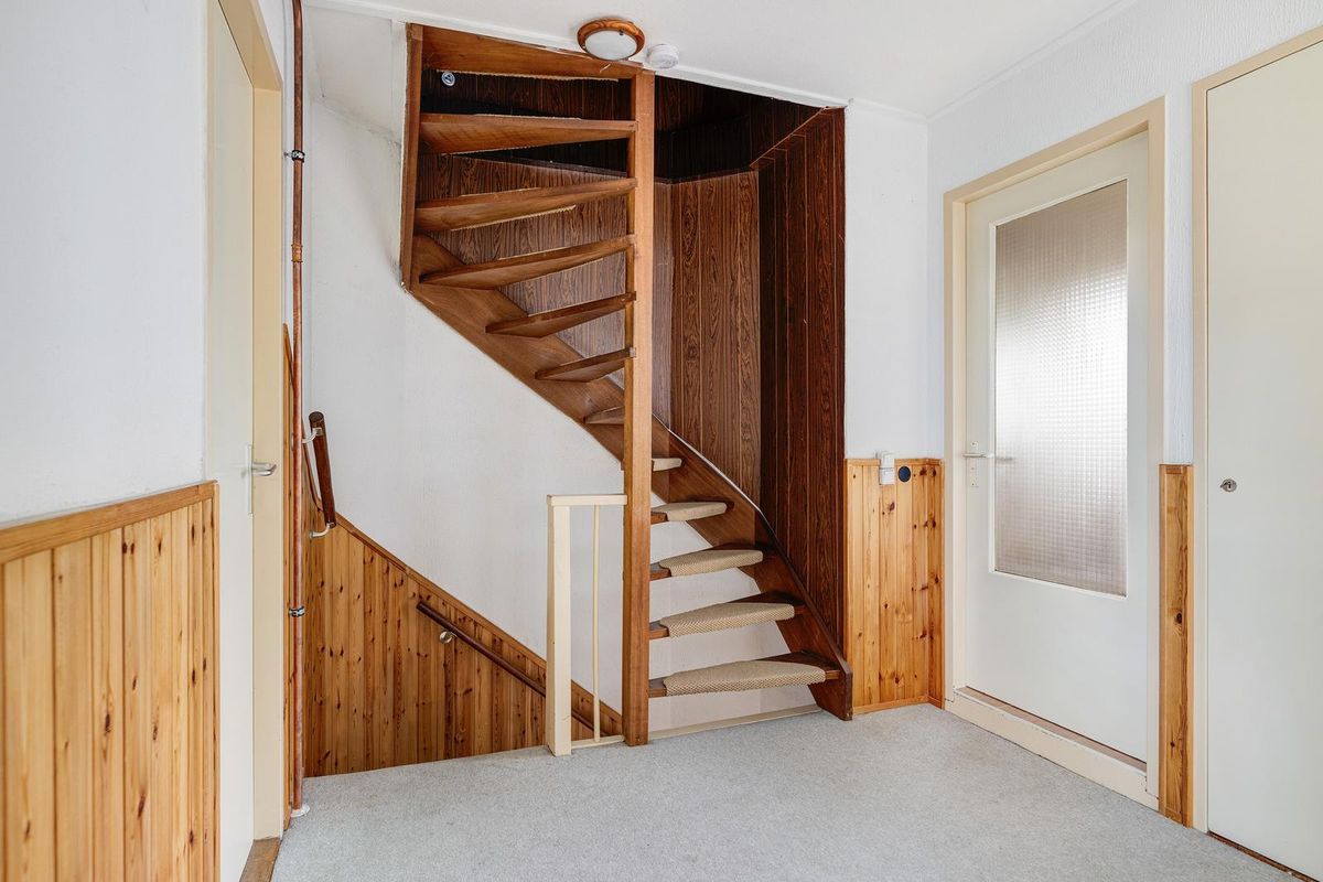 Via de vaste trap bereikt u de tweede verdieping met overloop, CV-opstelling en bergruimte achter de knieschotten.