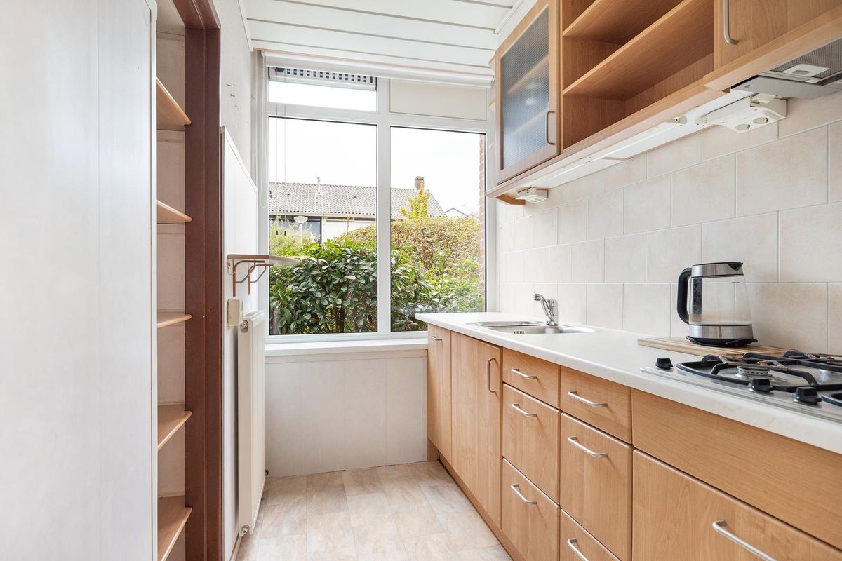 De aparte keuken heeft een rechte opstelling en beschikt over een 4-pits gaskookplaat, smalle vaatwasser en een praktische inbouwkast.