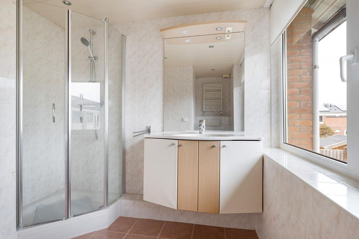 De badkamer is licht en netjes, voorzien van een douchecabine, wastafelmeubel met spiegel en opbergruimte, en een tweede hangend toilet. Dankzij het grote raam is er volop daglicht en natuurlijke ventilatie.