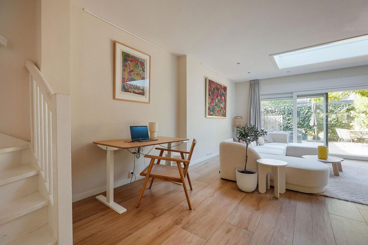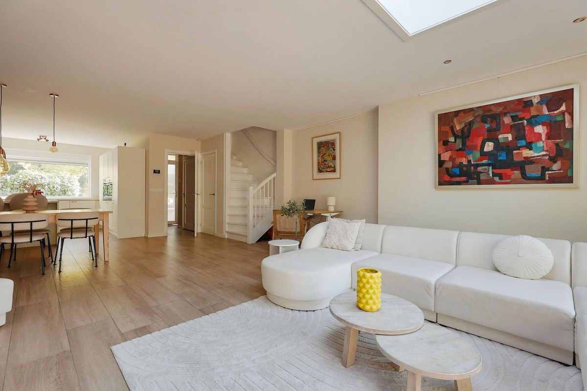 Begane grond: Via het fraai aangelegde terras met ochtendzon en een overkapping voor de fietsen, bereik je de woning. Door de gang met modern toilet kom je in de zeer royale, lichte uitgebouwde woonkamer met lichtstraat. Vanuit de woonkamer loop je de fijne en zonnige achtertuin in, gelegen op het zuidwesten. Aan de voorzijde vind je de moderne open keuken die van alle gemakken is voorzien zoals: inductiekookplaat, vaatwasser, oven, magnetron, bordenverwarmer, ruime koelkast en ruime vriezer. De hele begane grond is voorzien van vloerverwarming.