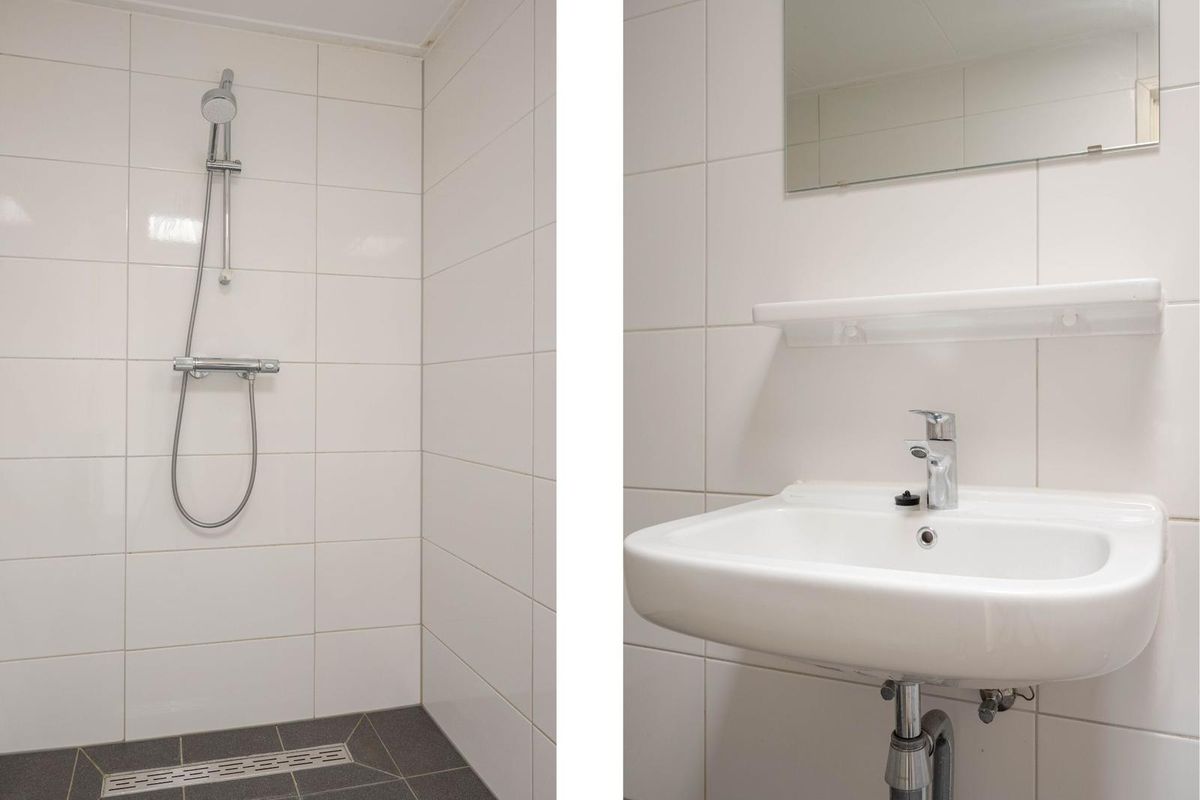 * Badkamer voorzien van inloopdouche, wastafel, wasmachine-aansluiting, een daklicht en geheel betegeld.