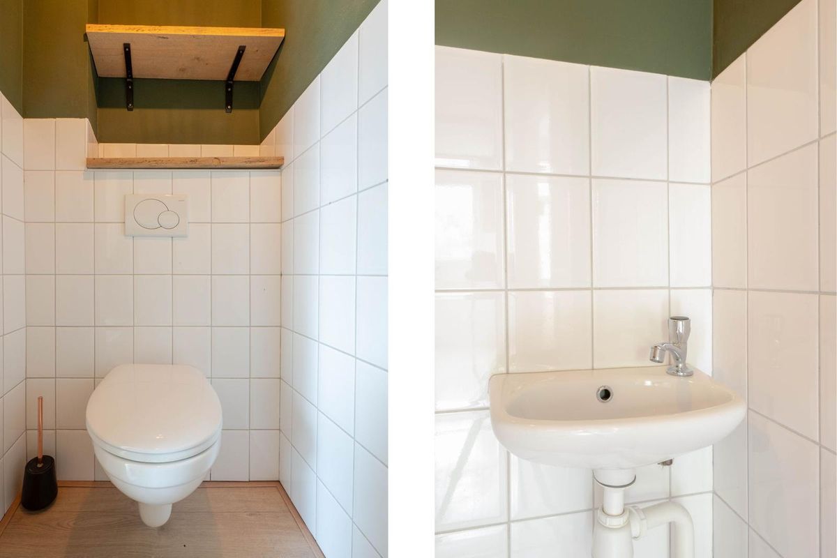 * Toiletruimte voorzien van wandtoilet, fonteintje en gedeeltelijk lichte betegeling.