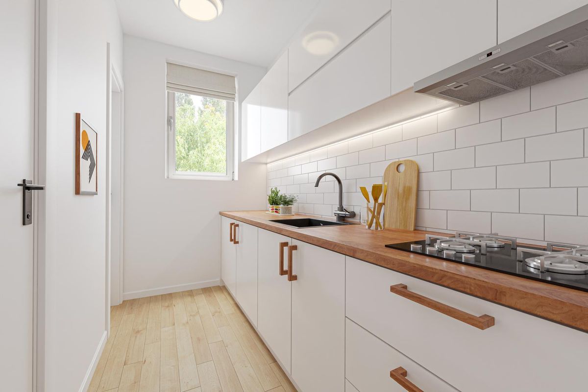 * Keukenruimte voorzien van laminaatvloer, gedeeltelijk betegelde wanden, deur naar het balkon en functionele keukenopstelling.