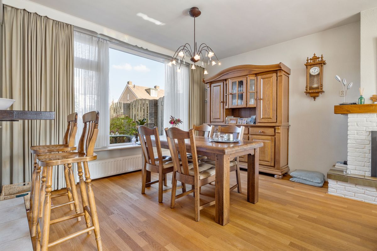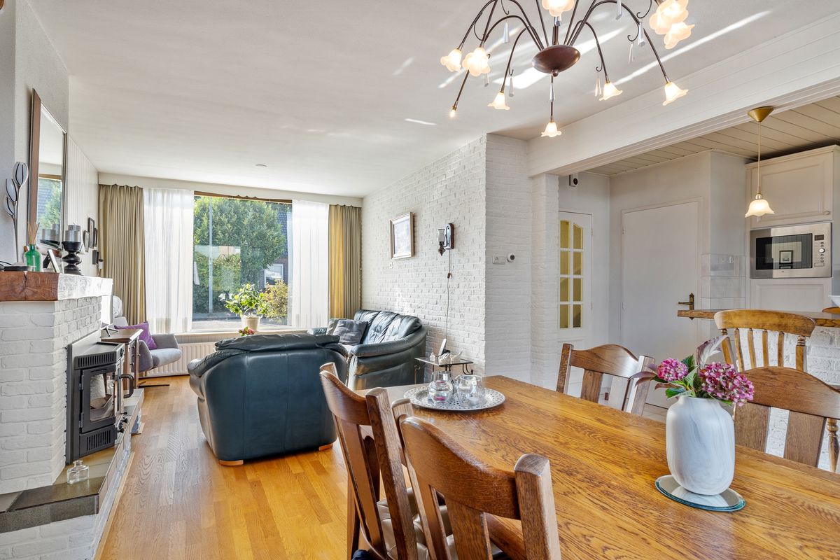 De woonkamer is voorzien van een parketvloer, een voorraadkast, een open keuken en een houtkachel. Door de grote raamvlakken aan zowel de voor-als achterzijde is er veel natuurlijke daglichttoetreding.
