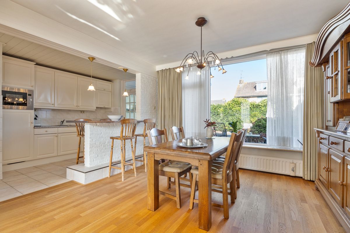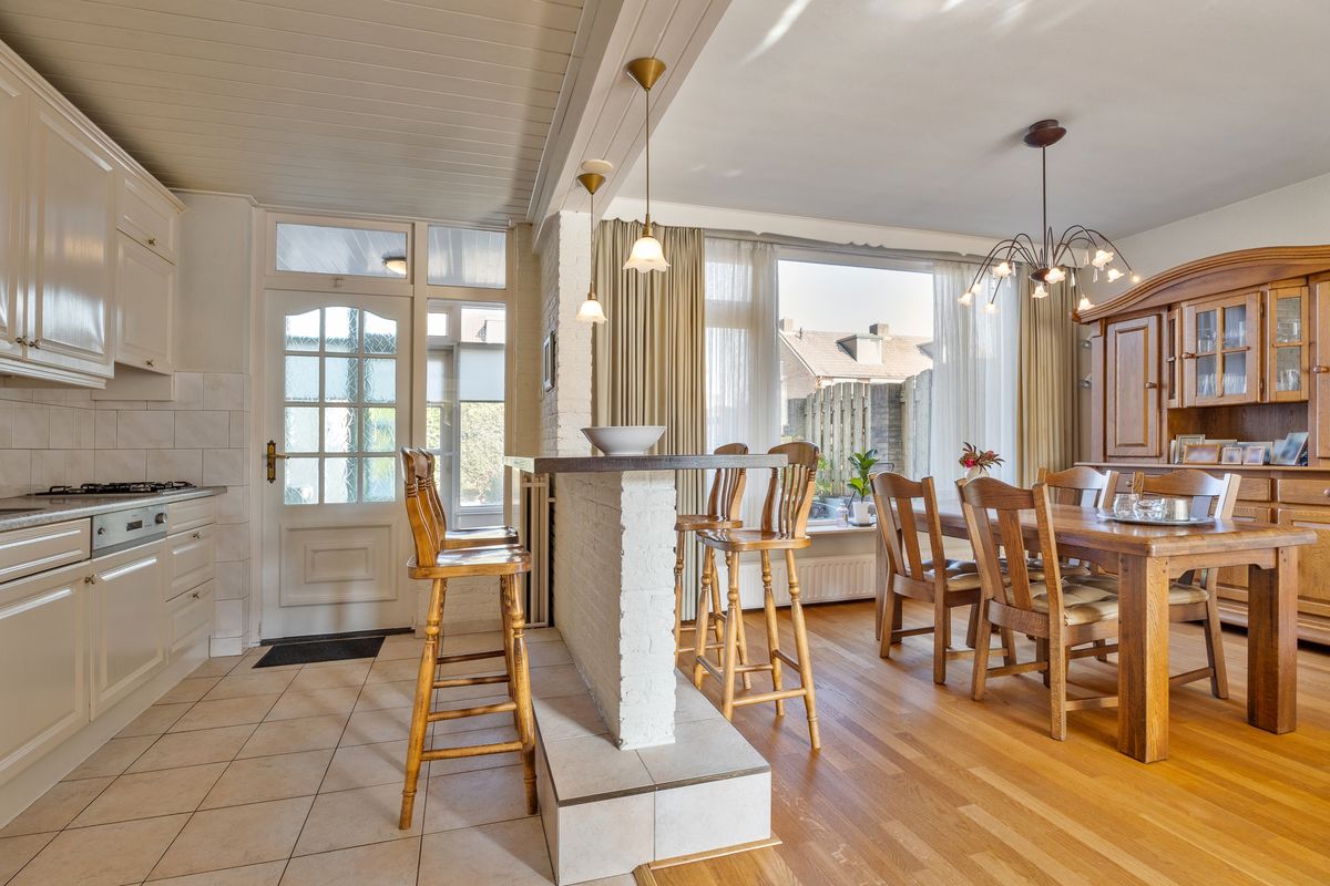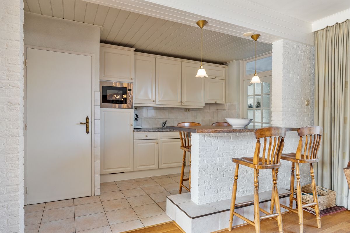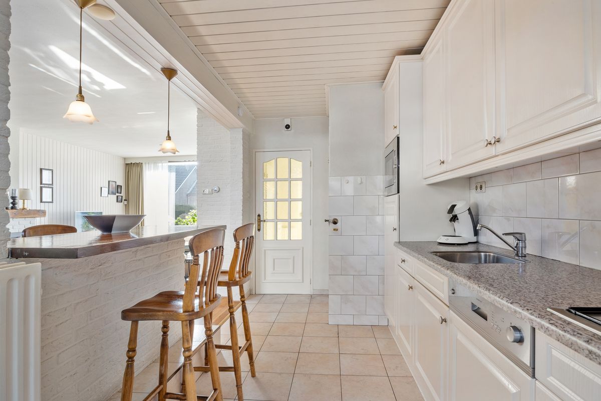 De keuken is voorzien van een tegelvoer en geplaatst in een rechte opstelling. De keuken heeft een 4-pits gaskookplaat, een afzuigkap, een vaatwasser, een combi-oven, een koelkast, een ontbijtbarretje en diverse boven-en onderkasten. Aansluitend heb je toegang tot de bijkeuken met aansluitingen voor de wasmachine en een tuindeur.