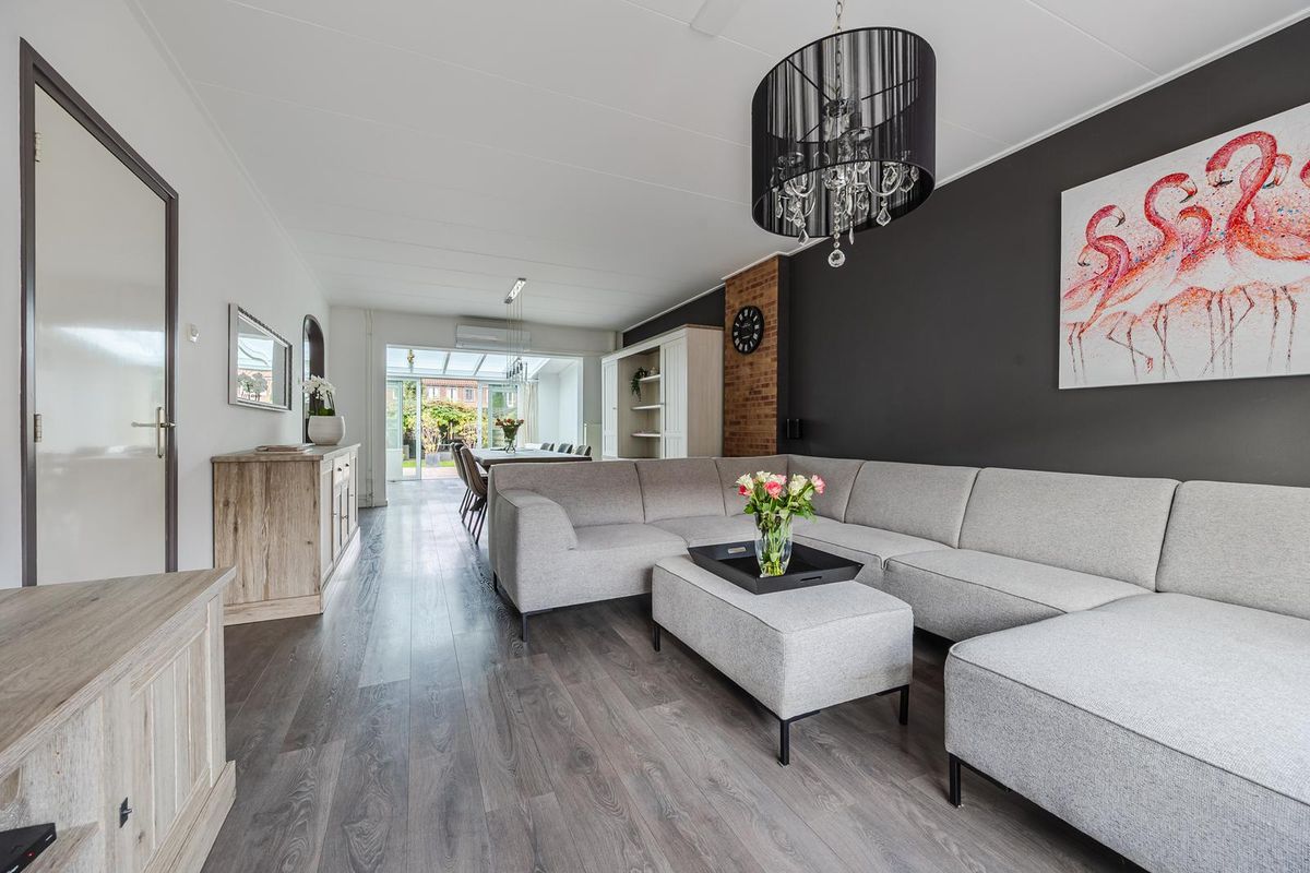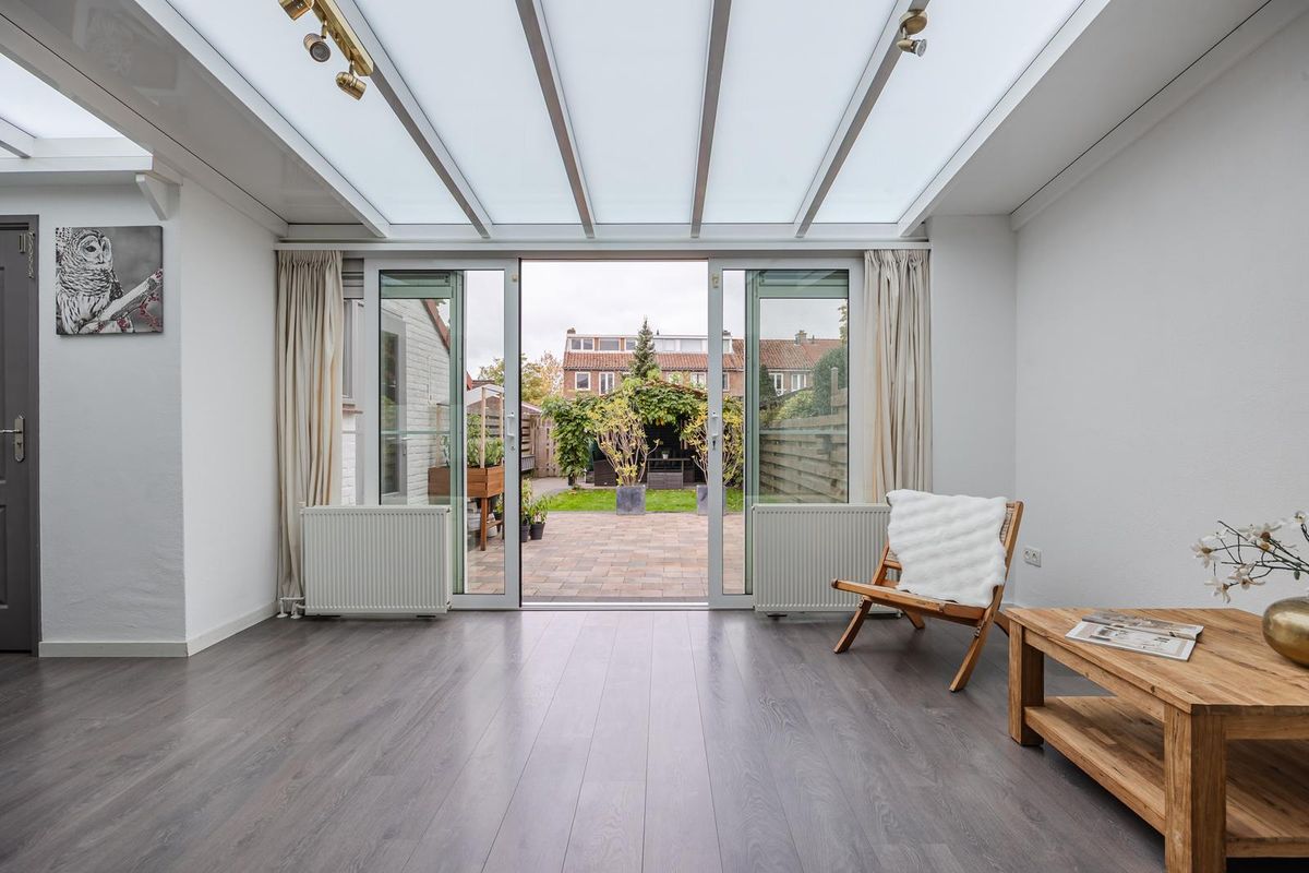 Vanuit de hal komt u in de woonkamer met een laminaatvloer en zeer veel lichtinval door de raampartijen en de glazen tuinkamer aan de achterzijde. De woonkamer is bijzonder netjes en voorzien van airconditioning voor verwarmen en koelen. De achterzijde van de woning is uitgebouwd en daar vindt u een geweldige tuinkamer met laminaatvloer en een grote glazen gevel met brede schuifpui en voorzien van zonwerend glas.