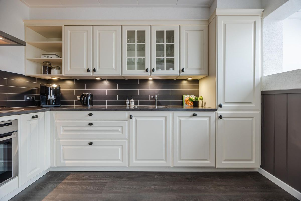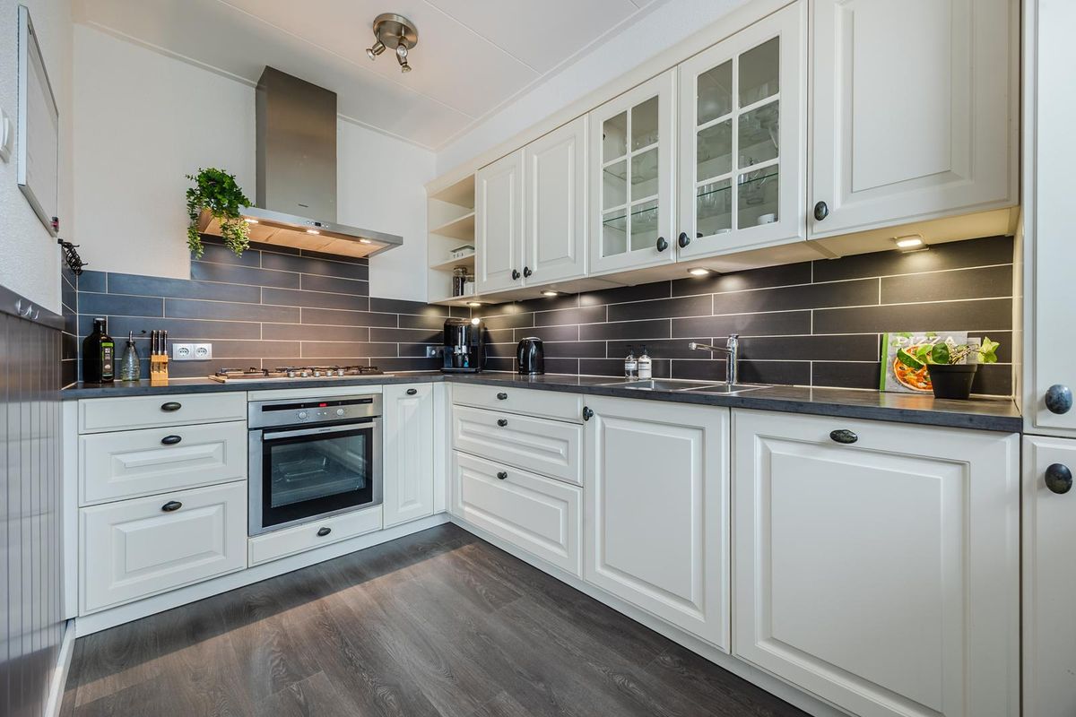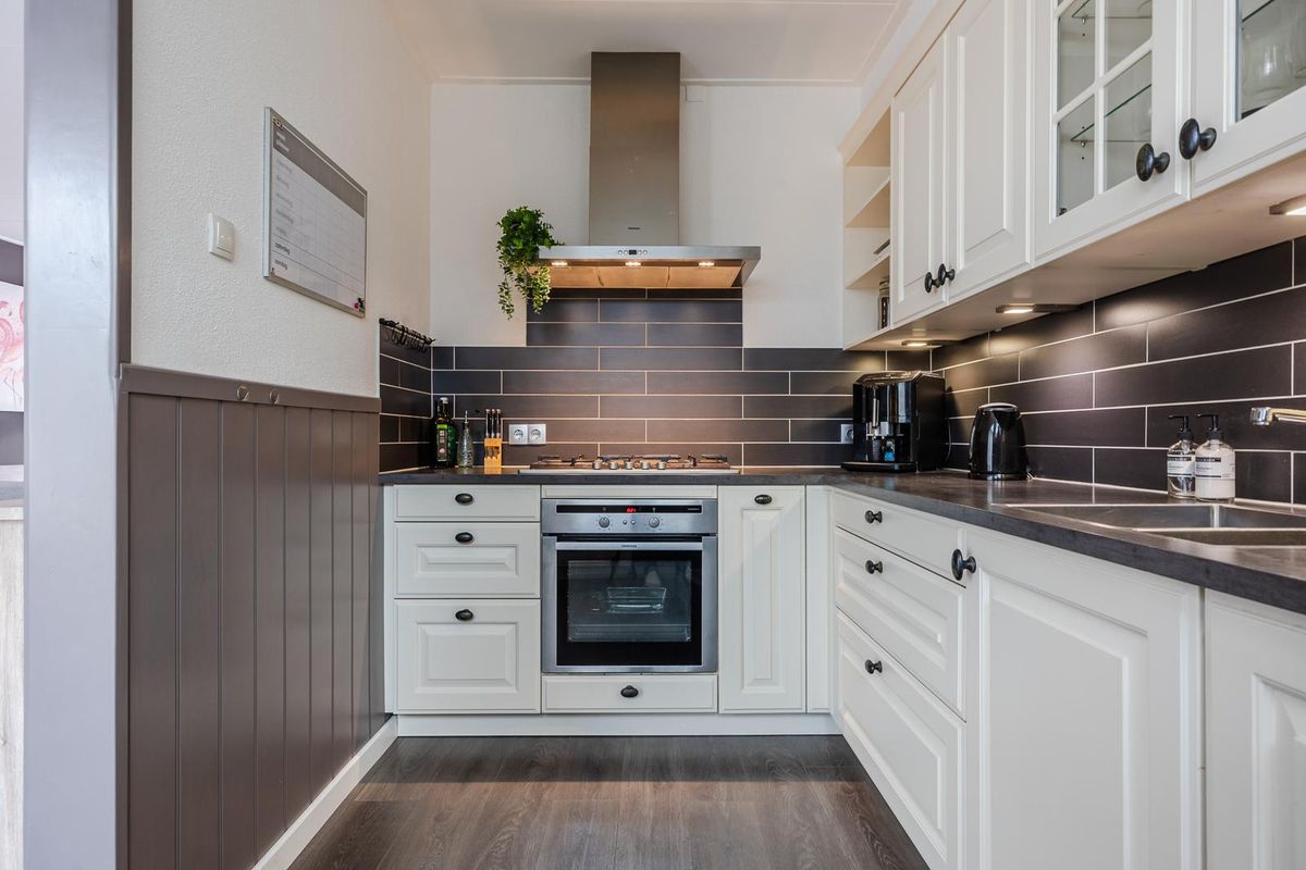 De halfopen keuken is voorzien van een laminaatvloer. De keuken is in een modern landelijke stijl uitgevoerd en is voorzien van inbouwapparatuur: 5 pits gaskookplaat, oven, afzuigkap, vaatwasser en een koelkast.