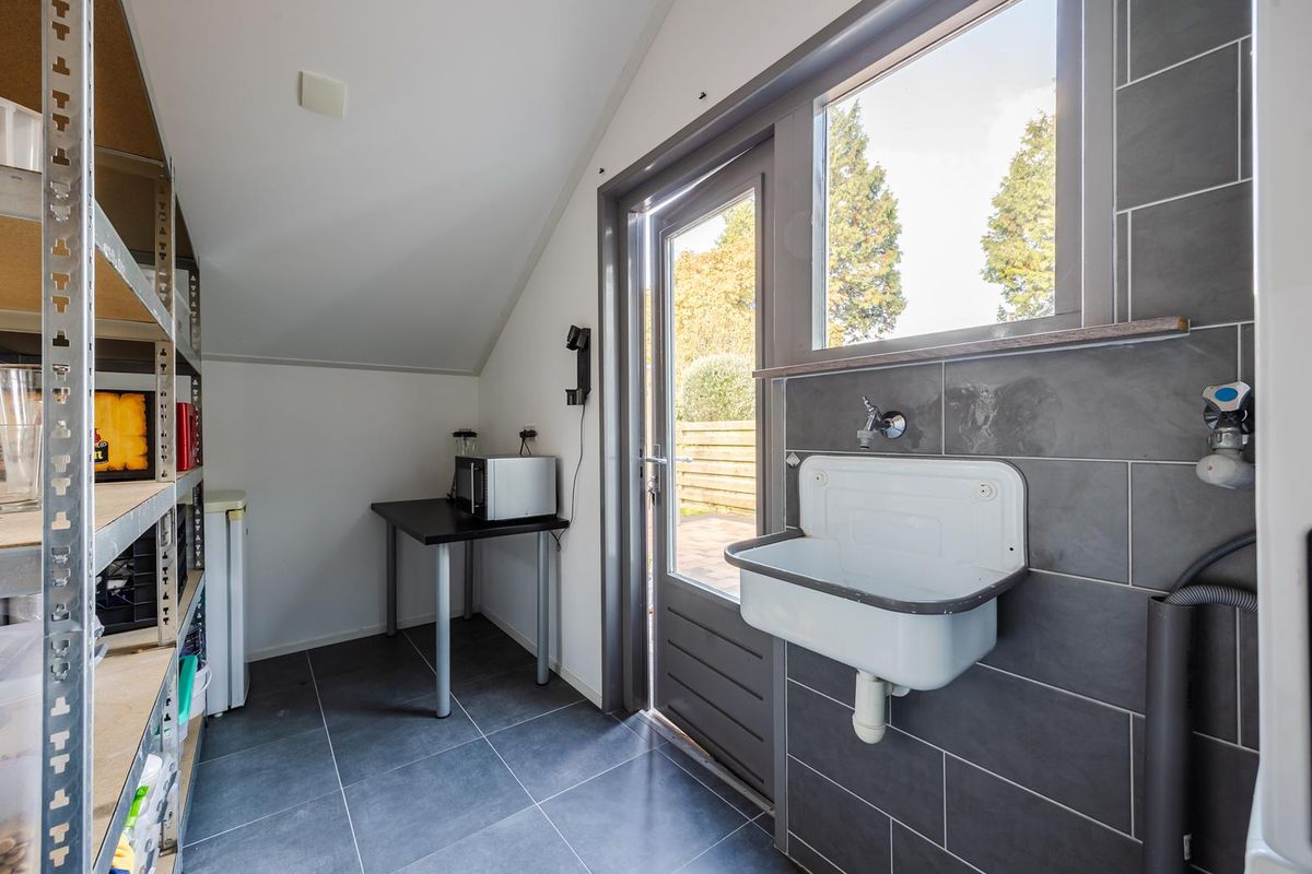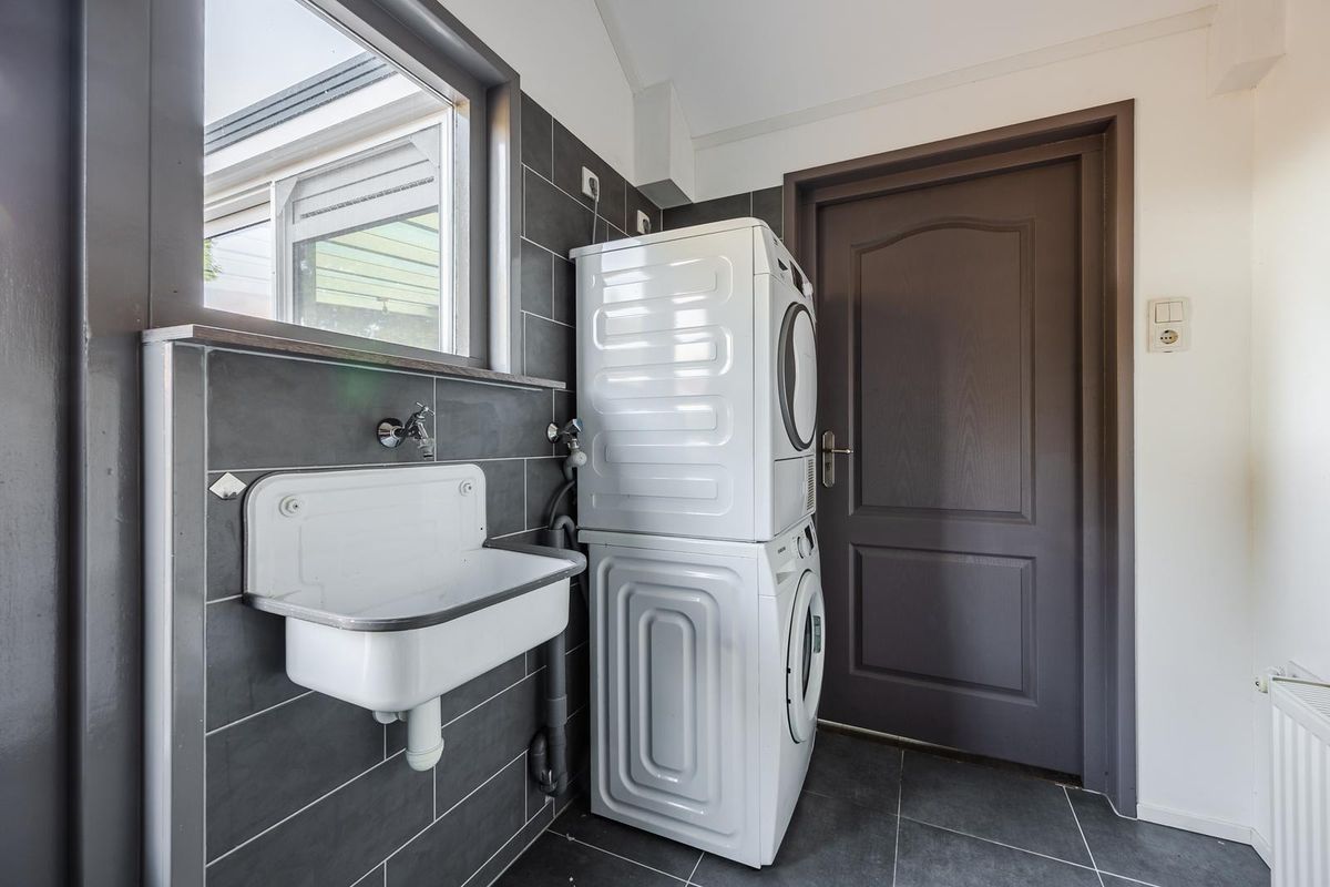 De bijkeuken met tegelvloer is te bereiken via de tuinkamer en biedt plaats aan de opstelling voor de wasmachine en droger. Vanuit de bijkeuken heeft u toegang tot de achtertuin.