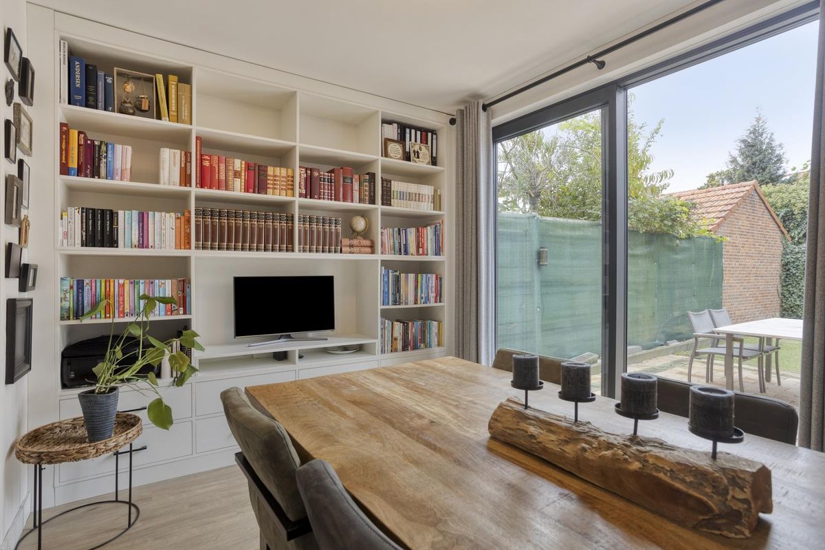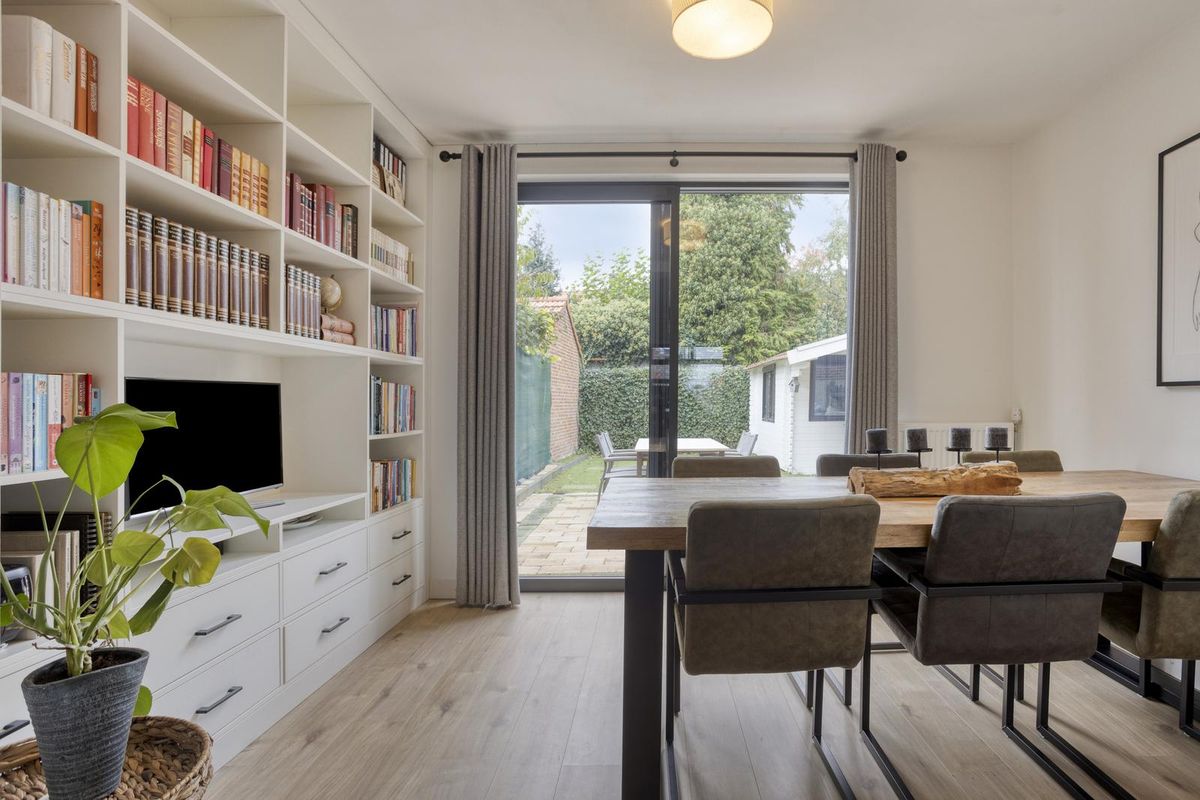 De uitbouw biedt bovendien plaats aan een ruime eetkamer met sfeervolle kastenwand en grote schuifpui naar buiten. Een heerlijke plek voor een uitgebreid diner, een rustige werkplek of een gezellige borrel met vrienden.